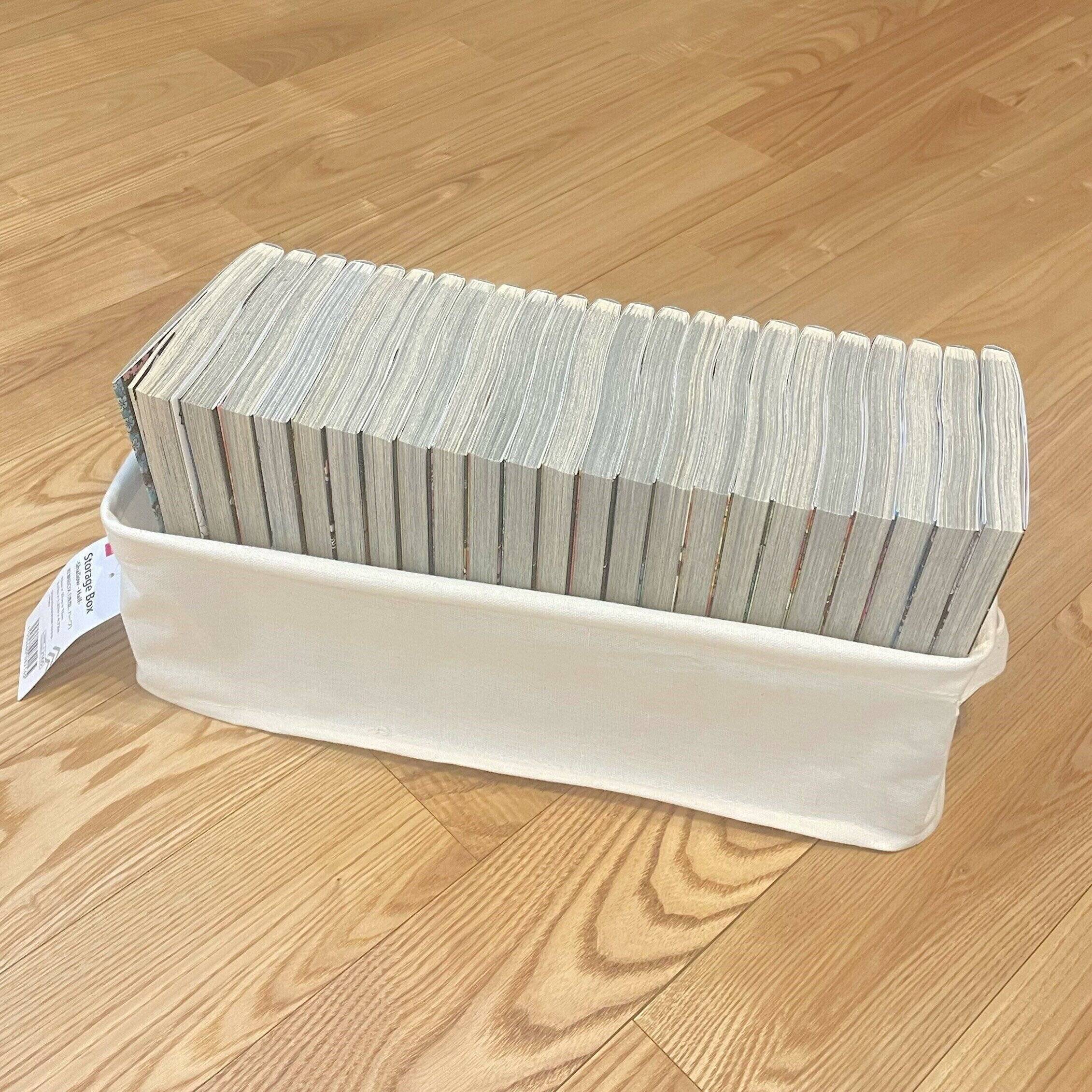 こちらのBOXはコミック収納にピッタリでした!写真ではコミック23巻が入っていますが、後2冊ほど入る余裕があるので、この収納BOX1つに25冊のコミックが入ります!両側に持ち手もついているので持ち運びもラクラク。ほかにも収納グッズで仕切るなどして、こまかいものを収納するのにも使えそうです。