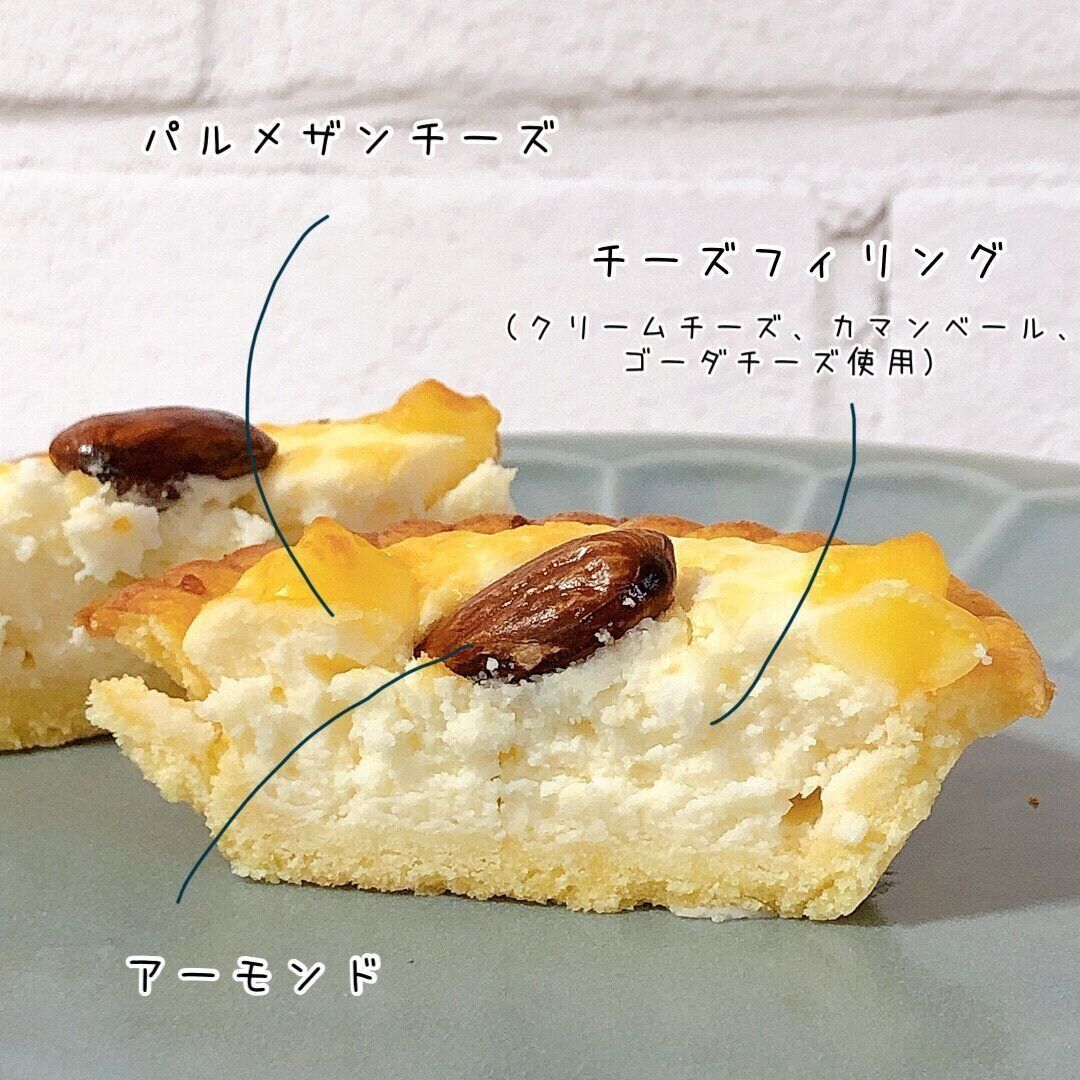 手のひらサイズの円形タルト生地の中には、3種類のチーズを使用したチーズフィリングが入っています。チーズフィリングには、デンマーク産クリームチーズをベースに、ゴーダチーズとカマンベールを使用。天面にはパルメザンチーズとアーモンドがのっています。