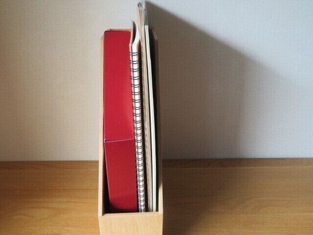 大きいのでしまう場所に困ると思われそうですけれど、厚みはあまりないので立ててしまえば場所をとりません。私は無印良品の木製ファイルボックスに入れて保管しています。1番右に入っているのが画用紙セットです。