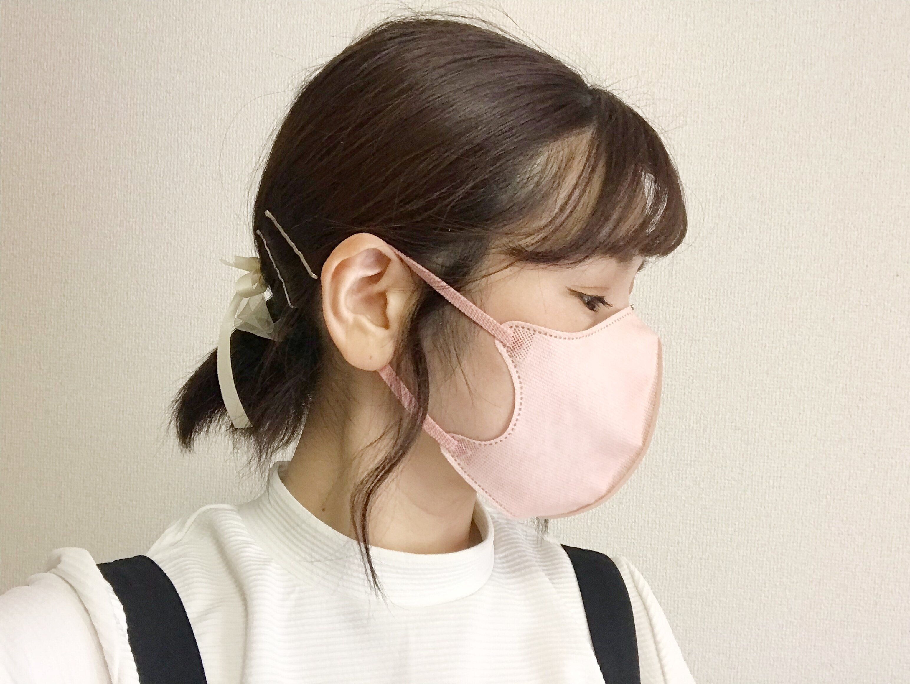 実際にピンクを着用して1日過ごした感想ですが、鼻とマスクの触れる部分が少ないので鼻のメイクがいつもよりも落ちていないことに感動しました。他のマスクだと鼻の頭だけメイクが落ちちゃうのでしっかりメイクをした日にもピッタリです。リップもメイク崩れにくいと感じました。口元の空間が広いので呼吸がしやすいだけではなく、リップメイクが落ちにくいというメリットもあります。