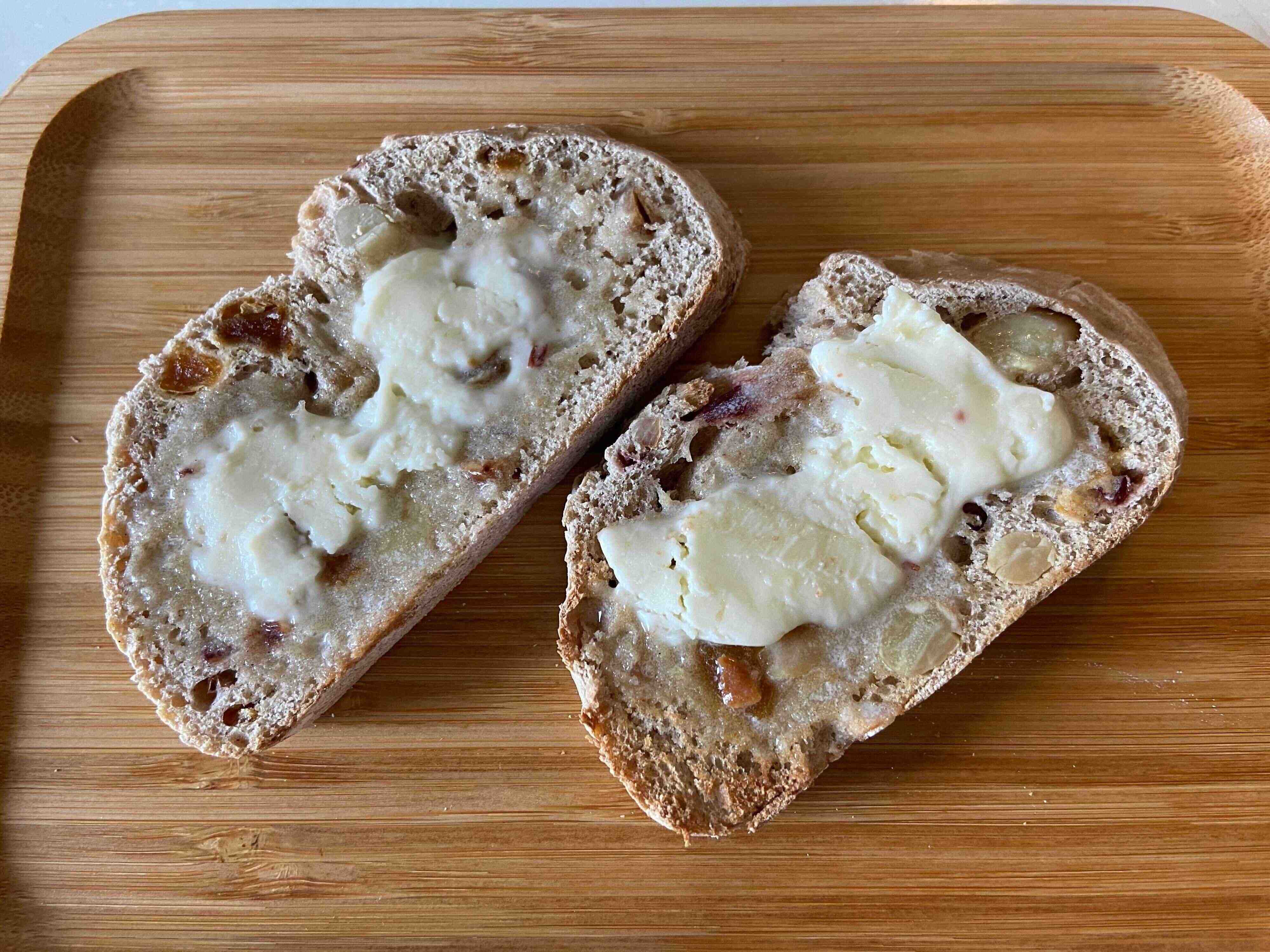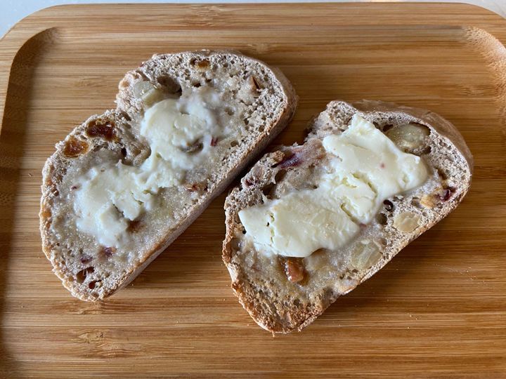 何もつけなくてもドライフルーツの甘みもあっておいしく食べられます。バターを塗るとコクが出てさらにおいしさが引き立ちました。ナッツの食感もアクセントになっている本格派ブレッドです。