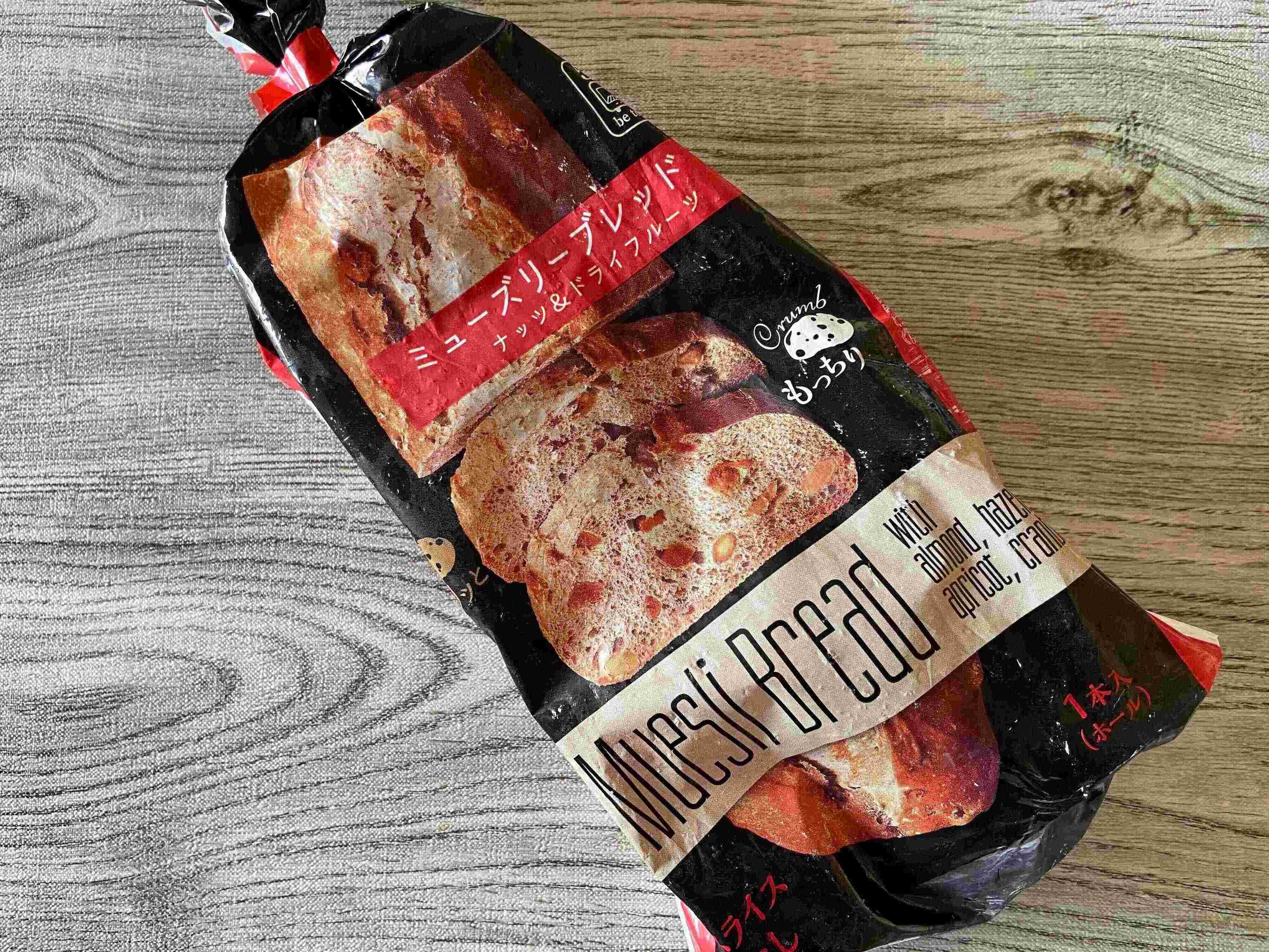 業務スーパーの冷凍コーナーで販売されている、「ミューズリーブレッド」(購入時価格:375円)。