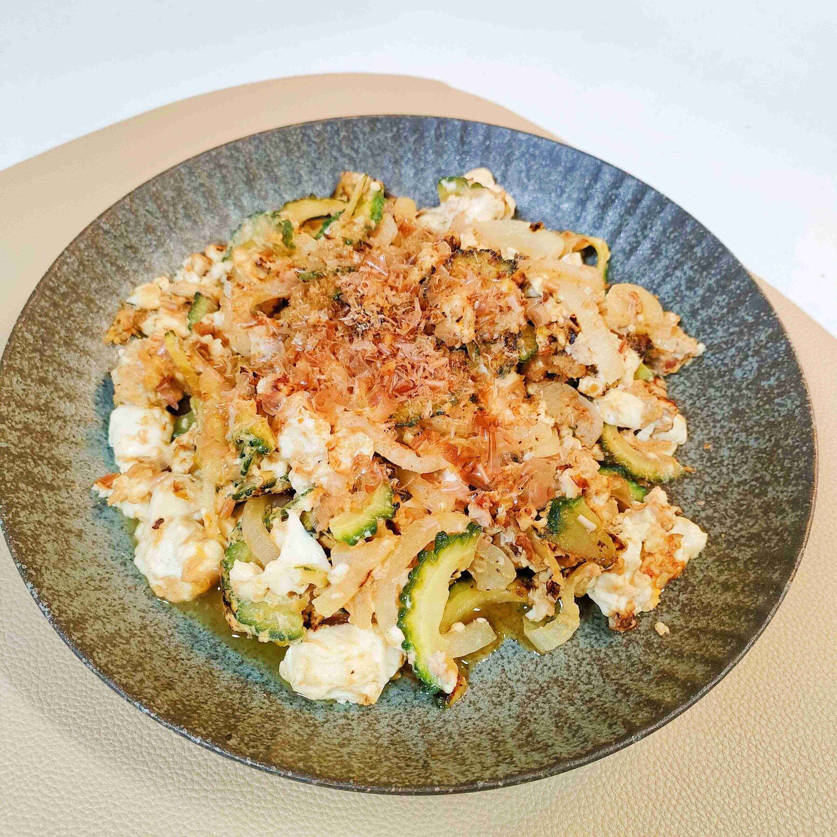 メインの食材としては、ゴーヤ、豆腐、卵、豚肉、かつお節です。