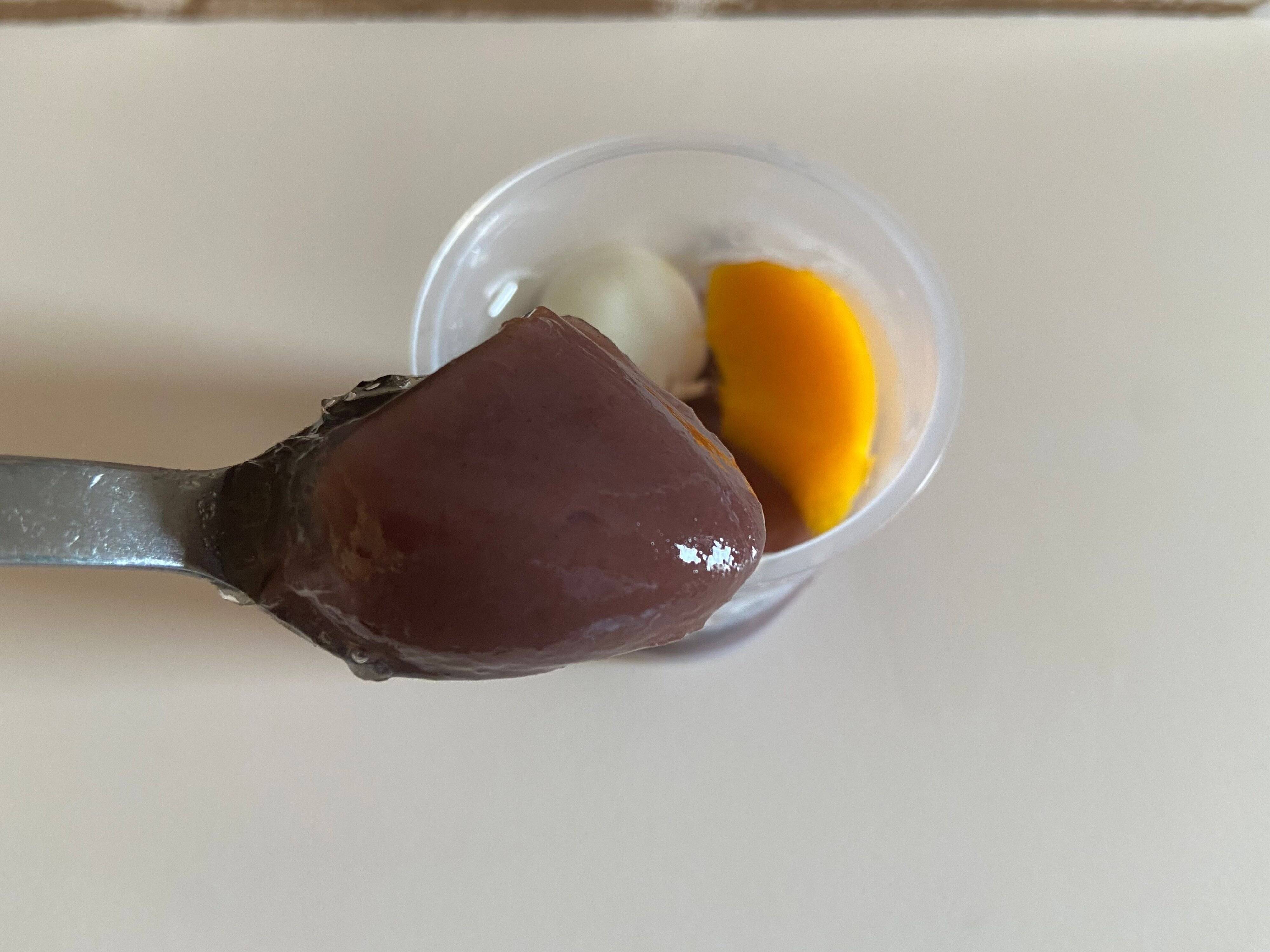黒豆のコクのある甘みと赤えんどうのほっくり感がふるふるのジュレと意外にもよく合います。黄桃の甘酸っぱさが爽やかでおいしいですね。