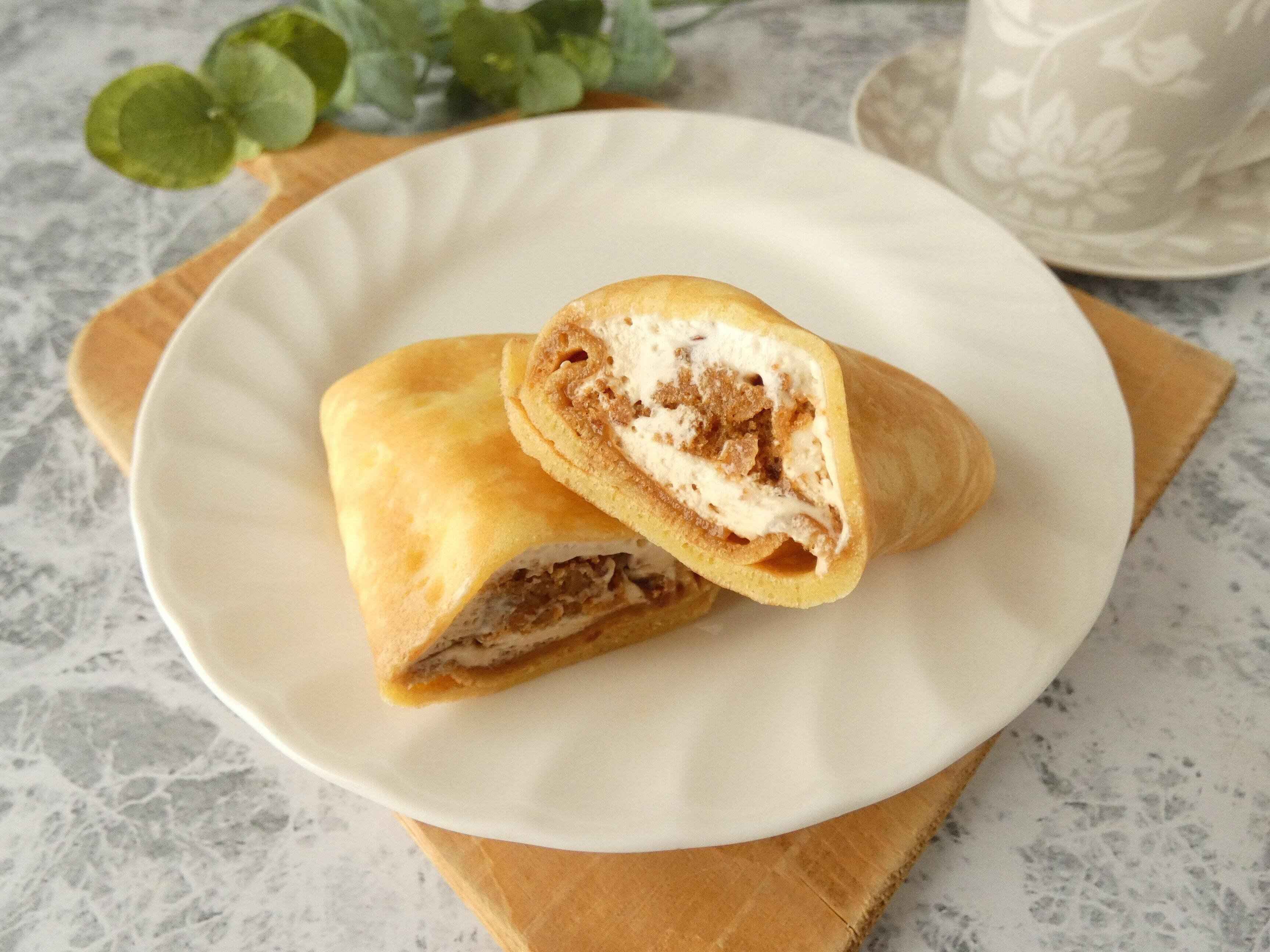 もちもちのクレープ生地にホイップクリームとキャラメルソース、ナッツ入りキャラメルブラウニーが包まれています。