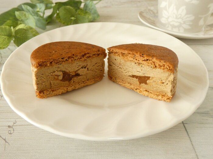 カットすると生地のもちもち感がわかります。ホイップクリームはあまり多くないですが、ナッツ入りキャラメルブラウニーがぎっしり!