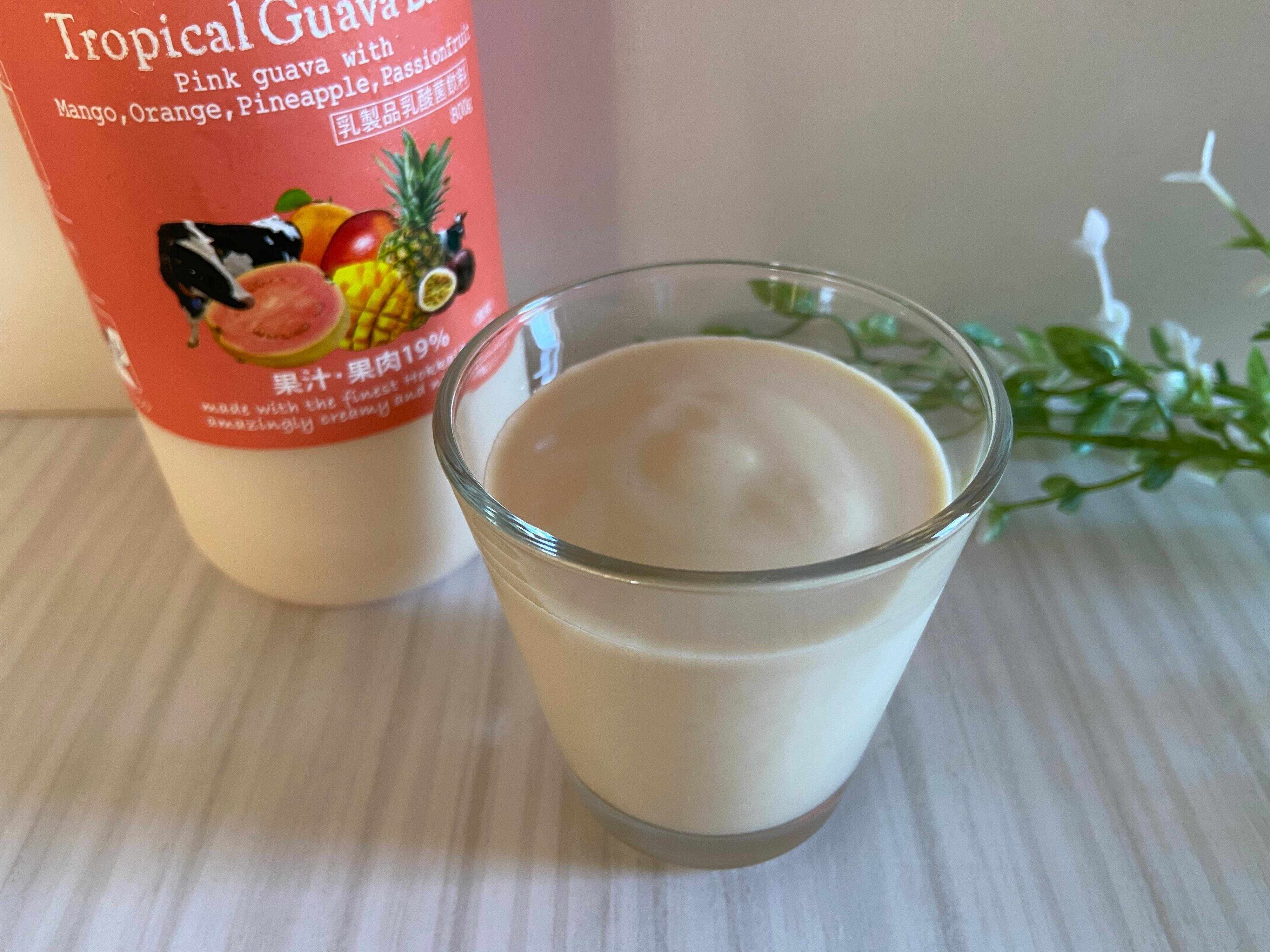 今回紹介するのはトロピカルグァバラッシー(購入時:758円)。北海道産の生乳にグァバ、マンゴー、オレンジ、パイン、パッションフルーツが入ったトロピカルな味わいのドリンク。