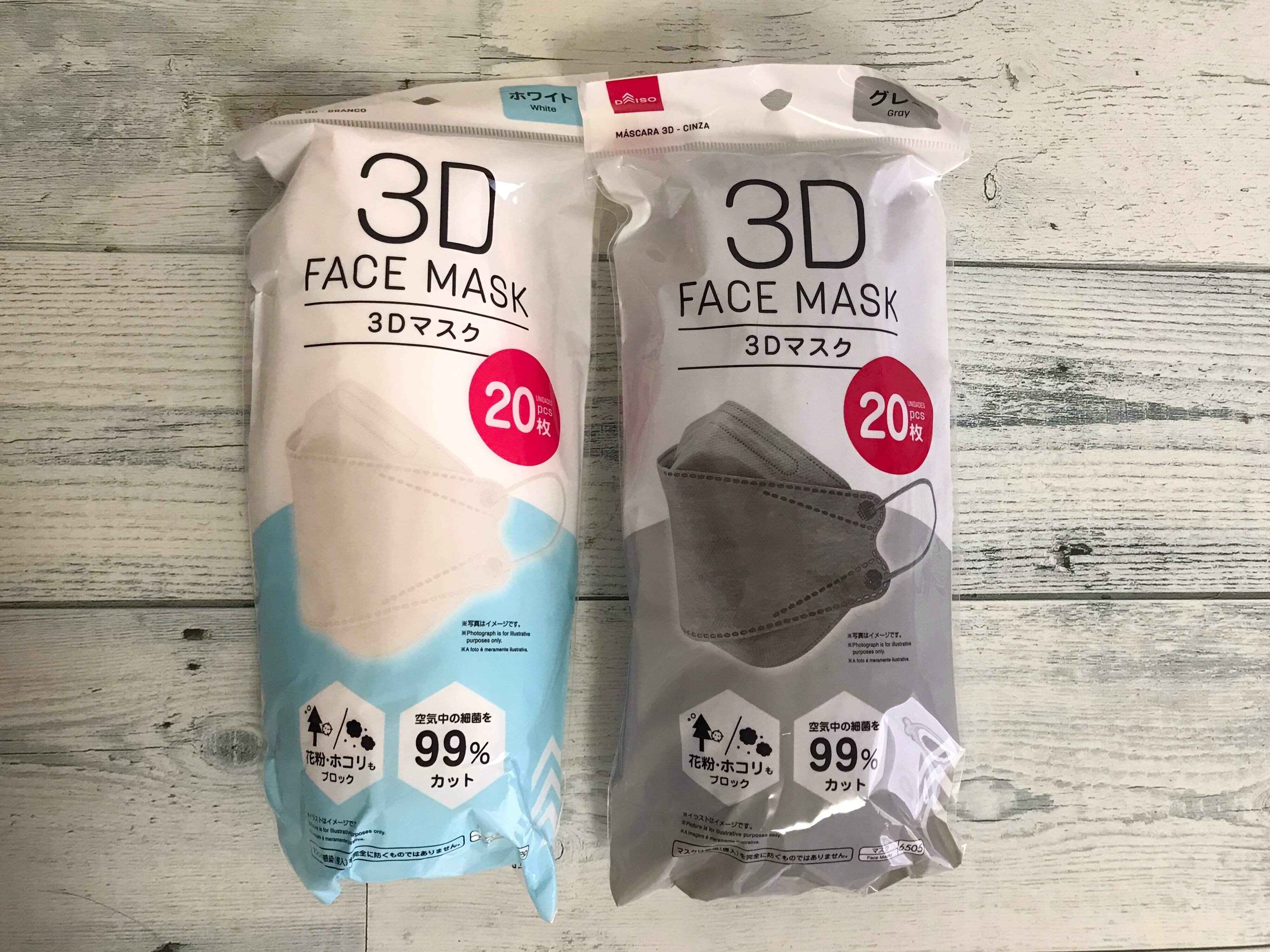 DAISOで発売されている「3D FACE MASK 20枚入り」は人気の高い3Dマスクが20枚も入っていて110円。人気商品の7枚入りと比べてもコスト面ではかなりお得です。カラーは筆者が購入したホワイト・グレーの他にピンクも販売されていました。