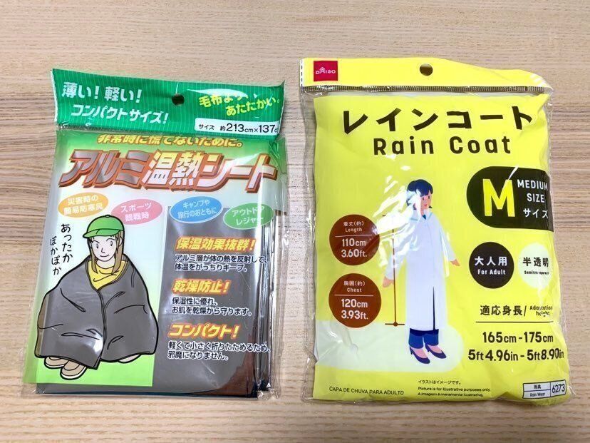 アルミ温熱シートと、レインコートは家族の人数分ずつ購入しました。