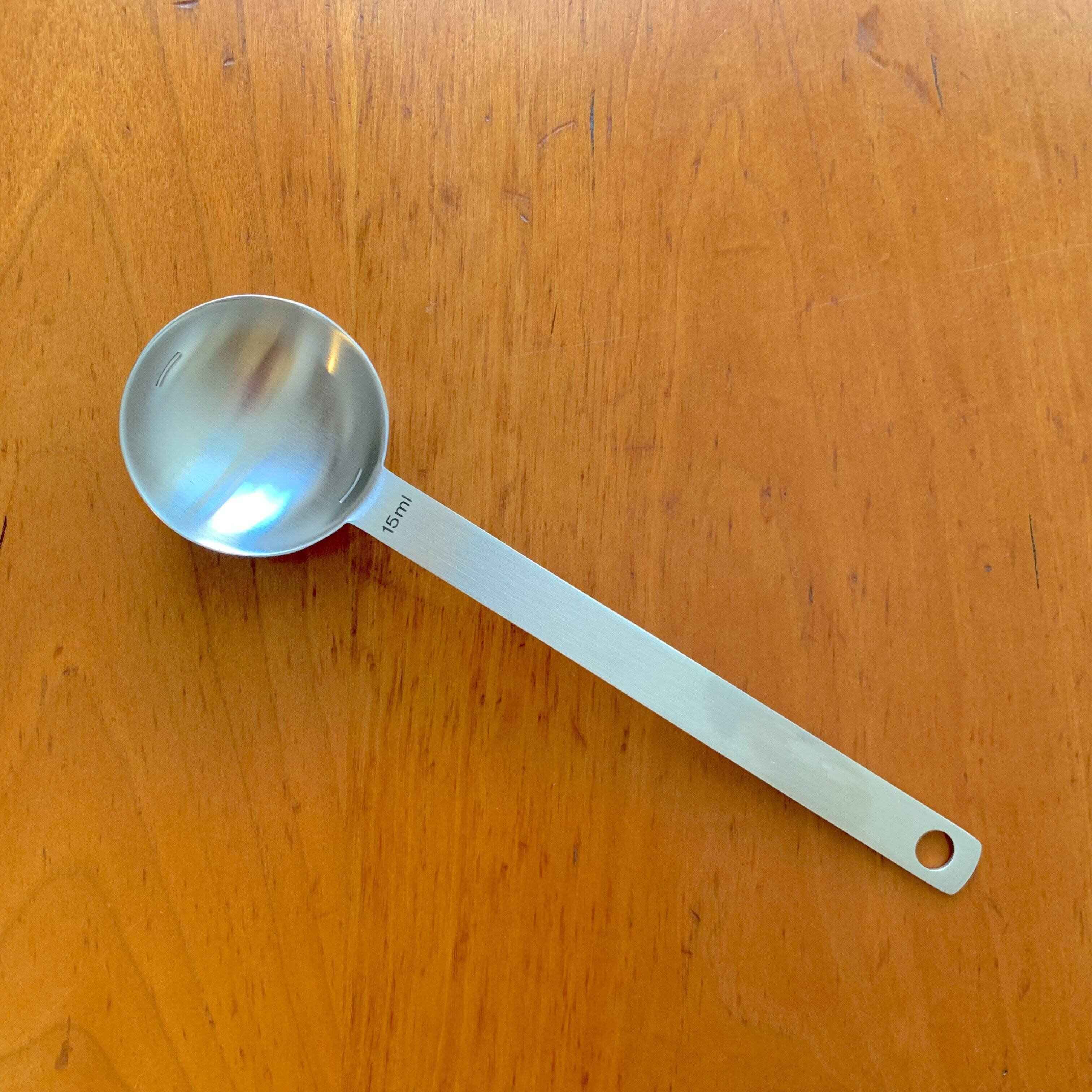 もうひとつのよさは、柄が長いのでボウルや容器の中に水没しないことです。柄が短い計量スプーンを使っていた時には、調味料を量った後にボウルや容器に計量スプーンを立てかけて、気がついたら計量スプーンが水没していた……なんてことがよくありました。