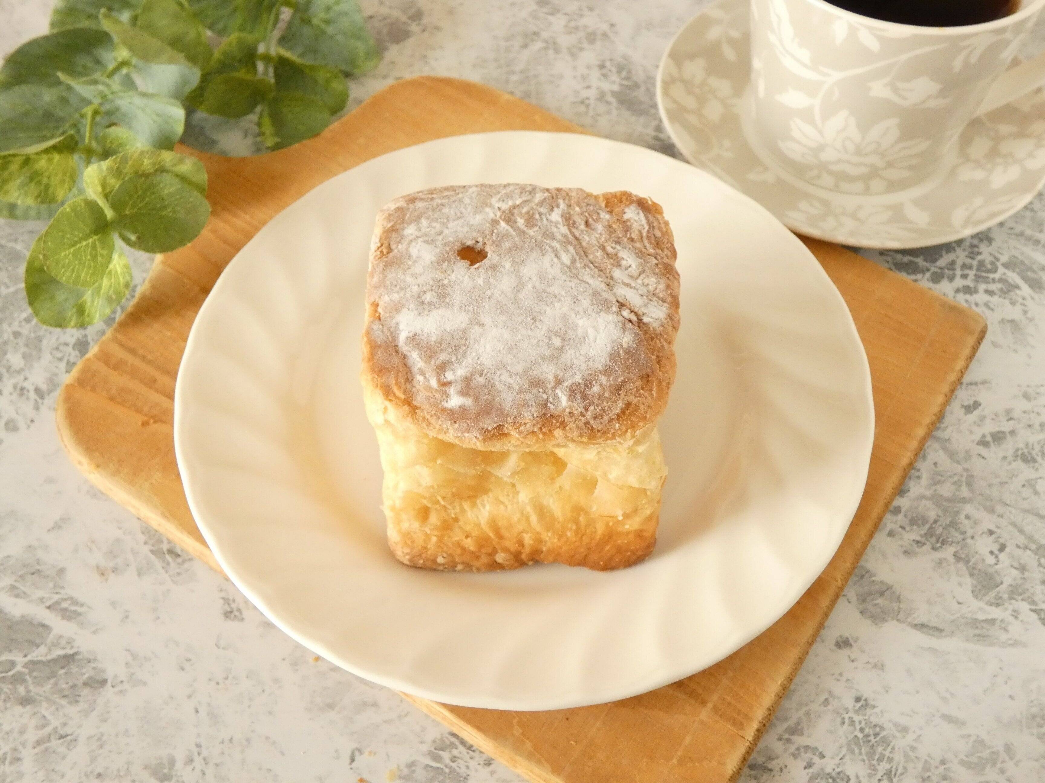 キューブ型のデニッシュ生地で、中にはたっぷりのカスタード入り。上には粉砂糖がかかっています。