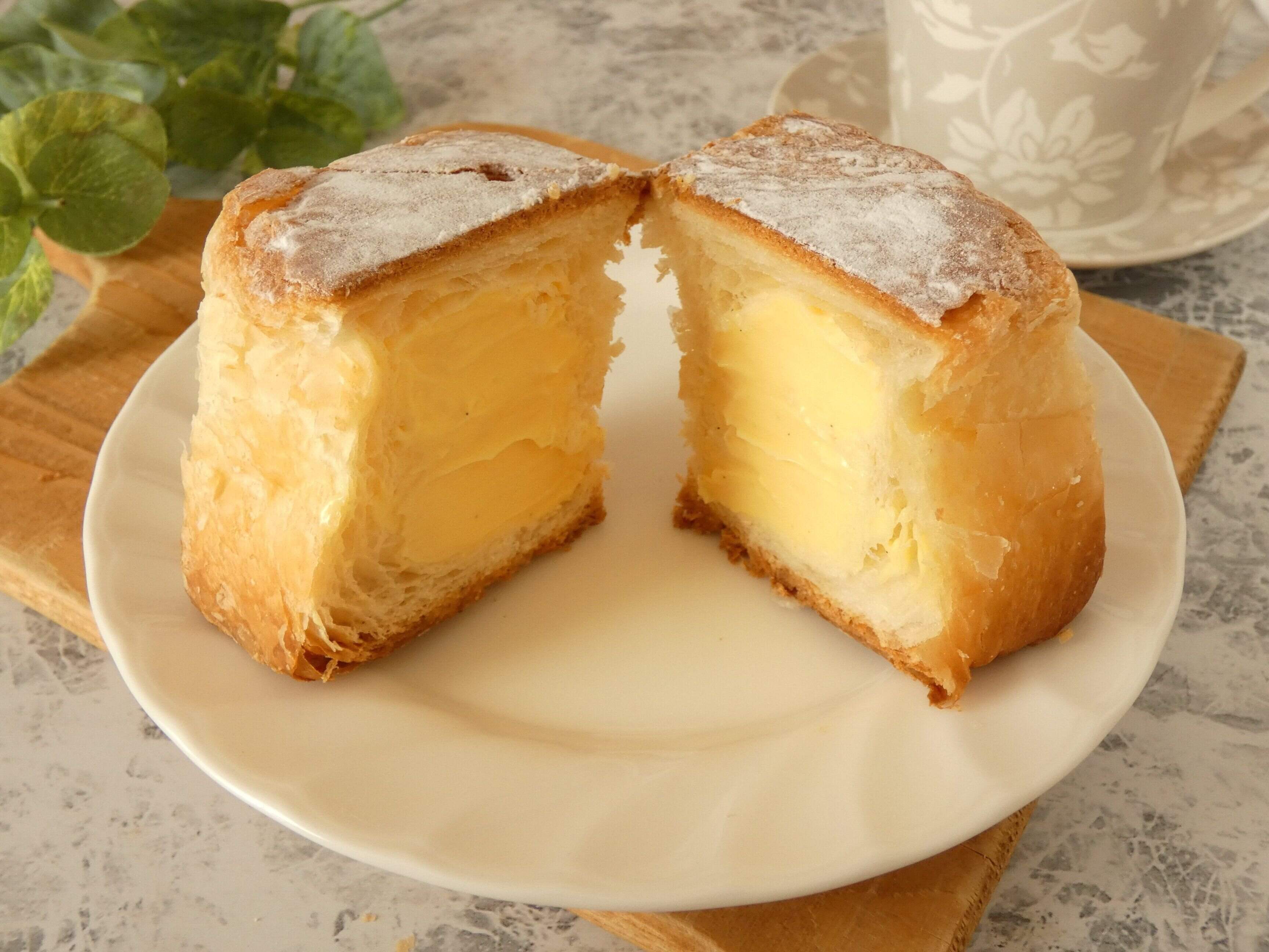デニッシュ生地はサクサクで、バターの香りが広がります。半分に切るとカスタードがぎっしり!これだけたっぷり入っているとどこから食べてもカスタードが出てきます。とろ~りとした柔らかいカスタードで、濃厚なめらか食感。