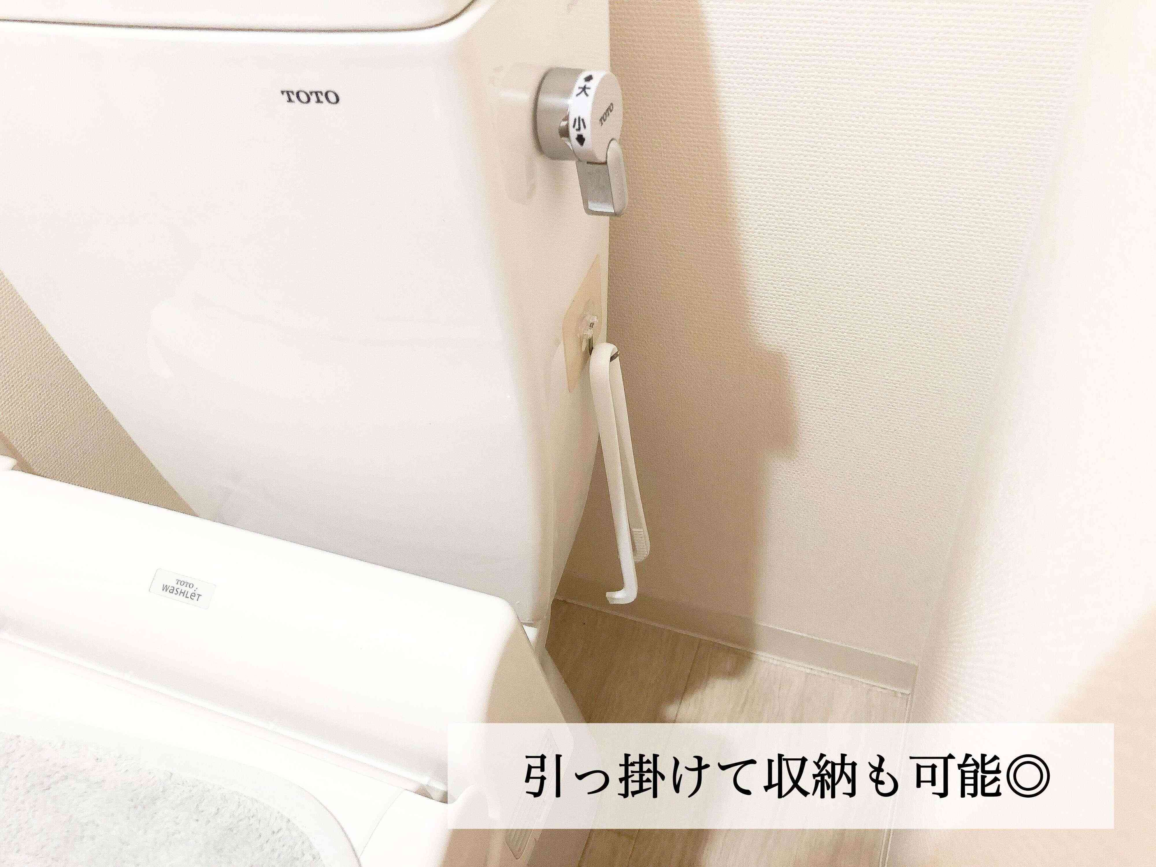 ちなみに我が家では、専用ケースは使わずに、セリアの「貼ってはがせるフック」を便器に貼って、引っ掛けて収納しています。