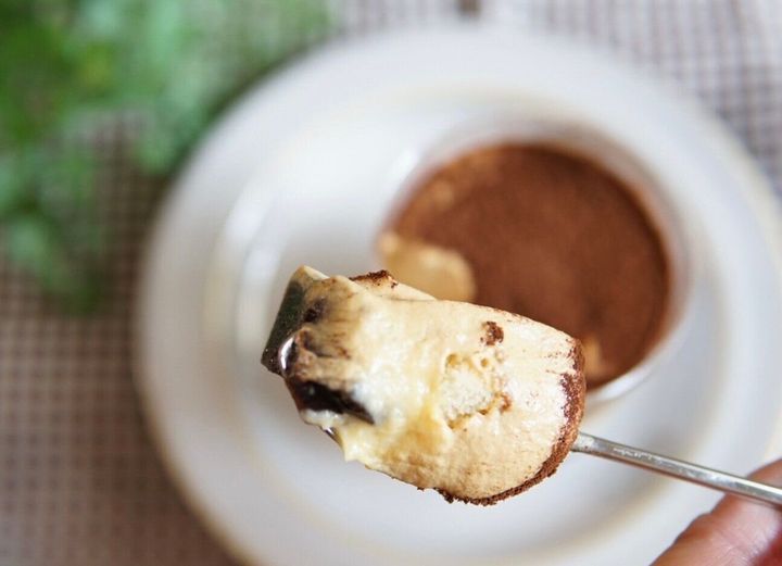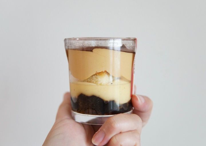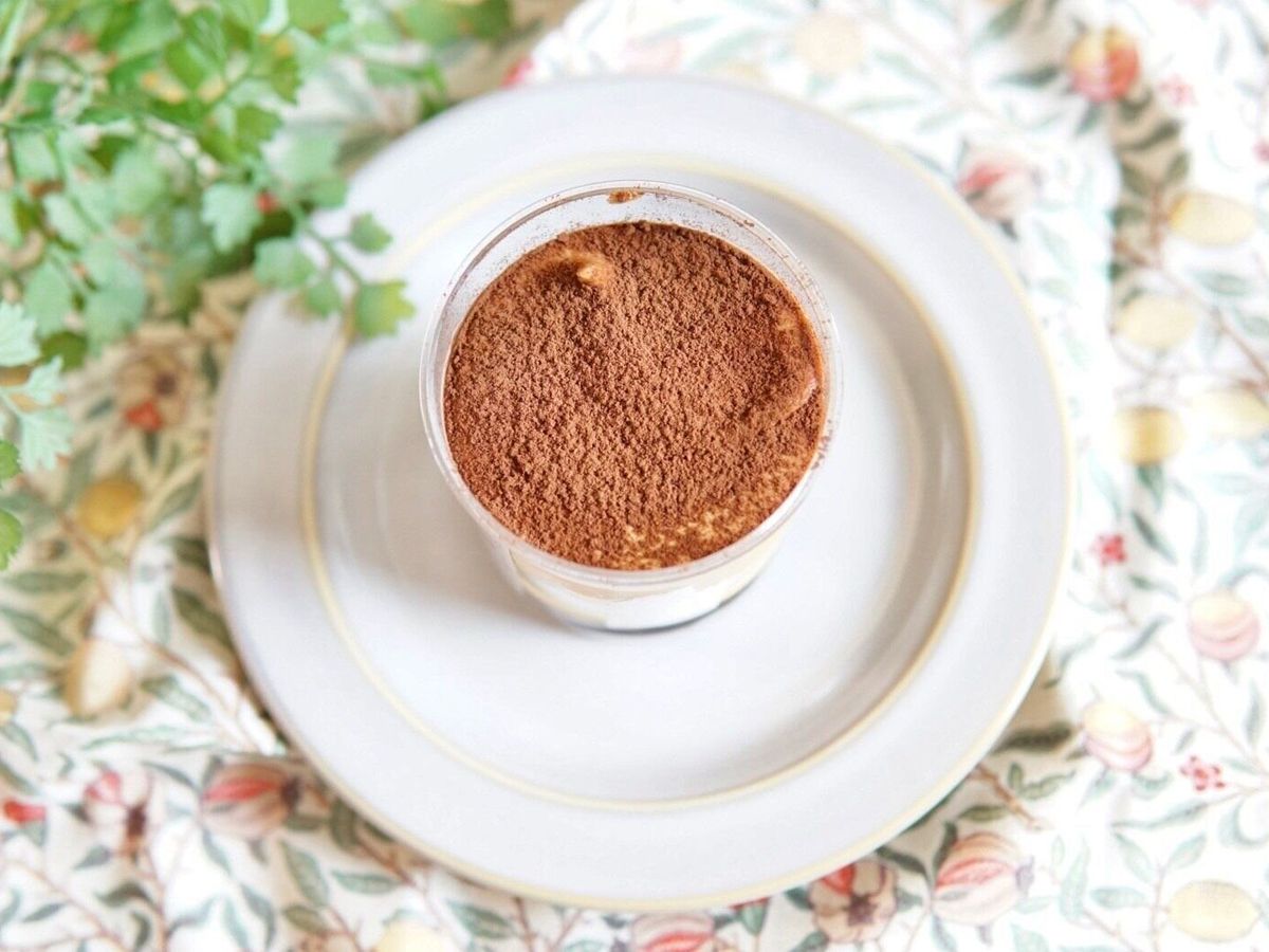 下からほろ苦珈琲ジュレ、カスタードクリーム、ホワイトチョコクランチ、スポンジ生地、キャラメルホイップ、上にはココアパウダーが。上から見るとティラミスのようで、横から見ると様々なブラウンの組み合わせが美しく、とても美味しそうです。