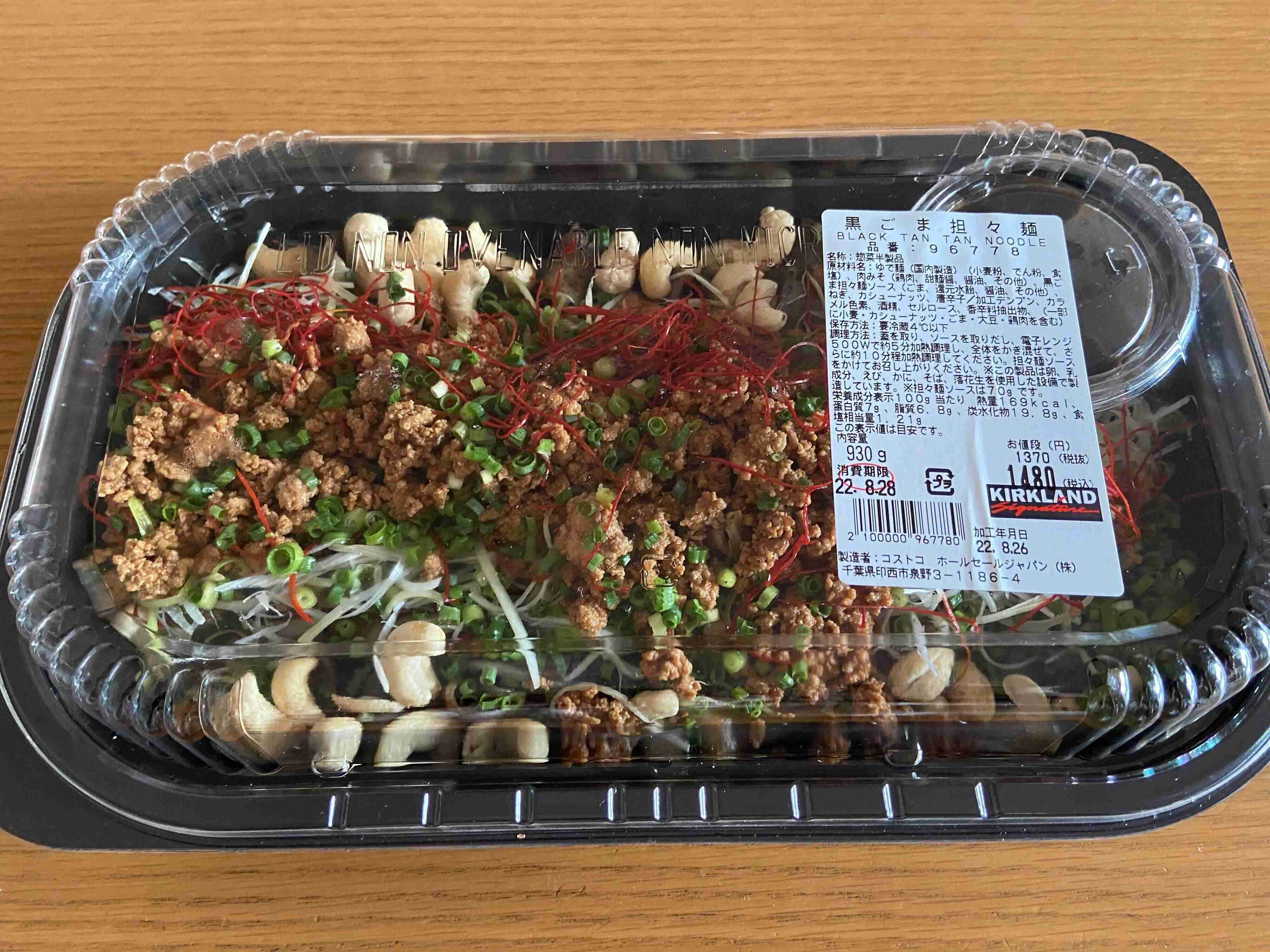 コストコデリコーナーの新商品「黒ごま担々麺」(購入時:1,480円)。担々麺といえば白ごまのイメージですがこちらは珍しい黒ごま使用です。