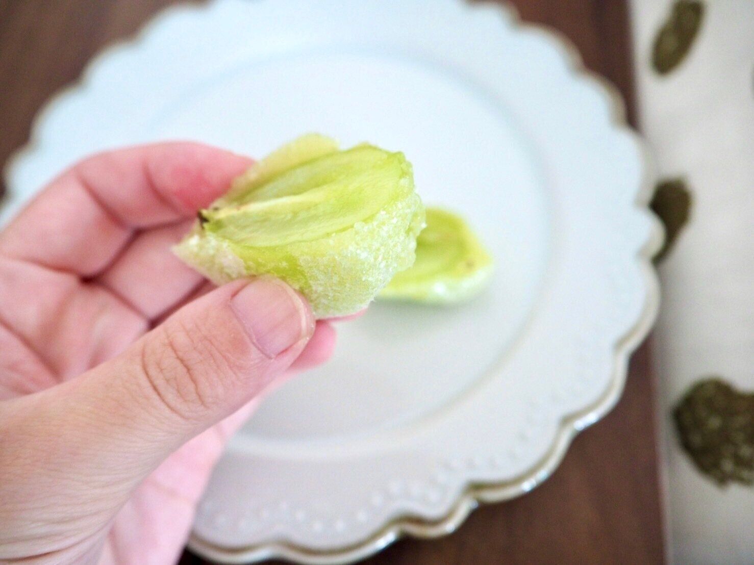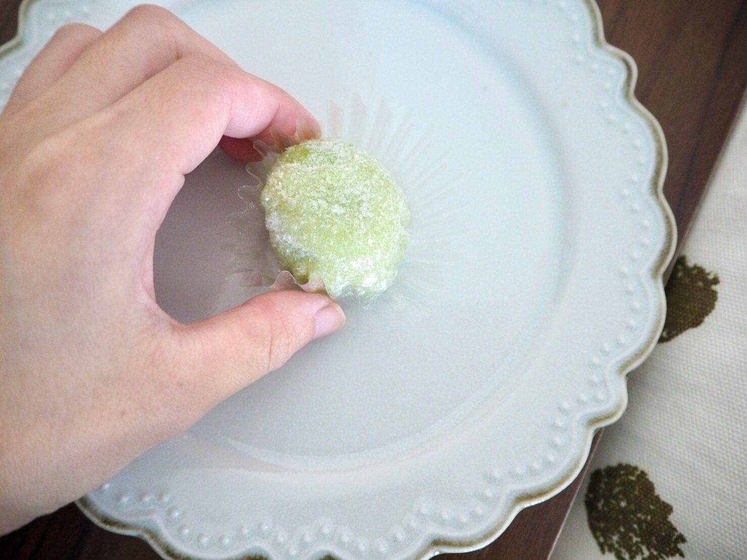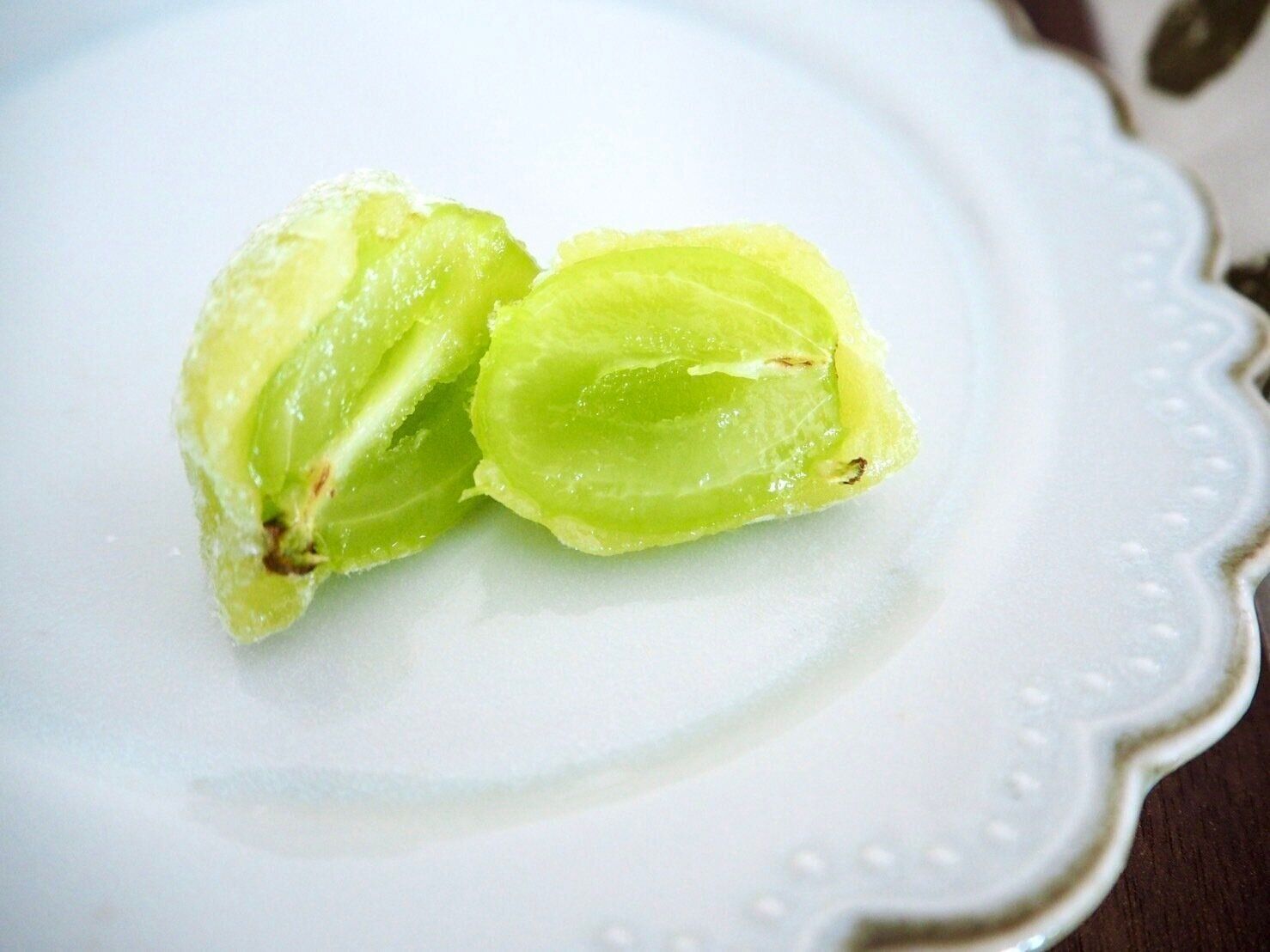 求肥の甘さがかなり控えめな分、シャインマスカット本来の甘さと果汁がくちの中にじゅわっと広がります。