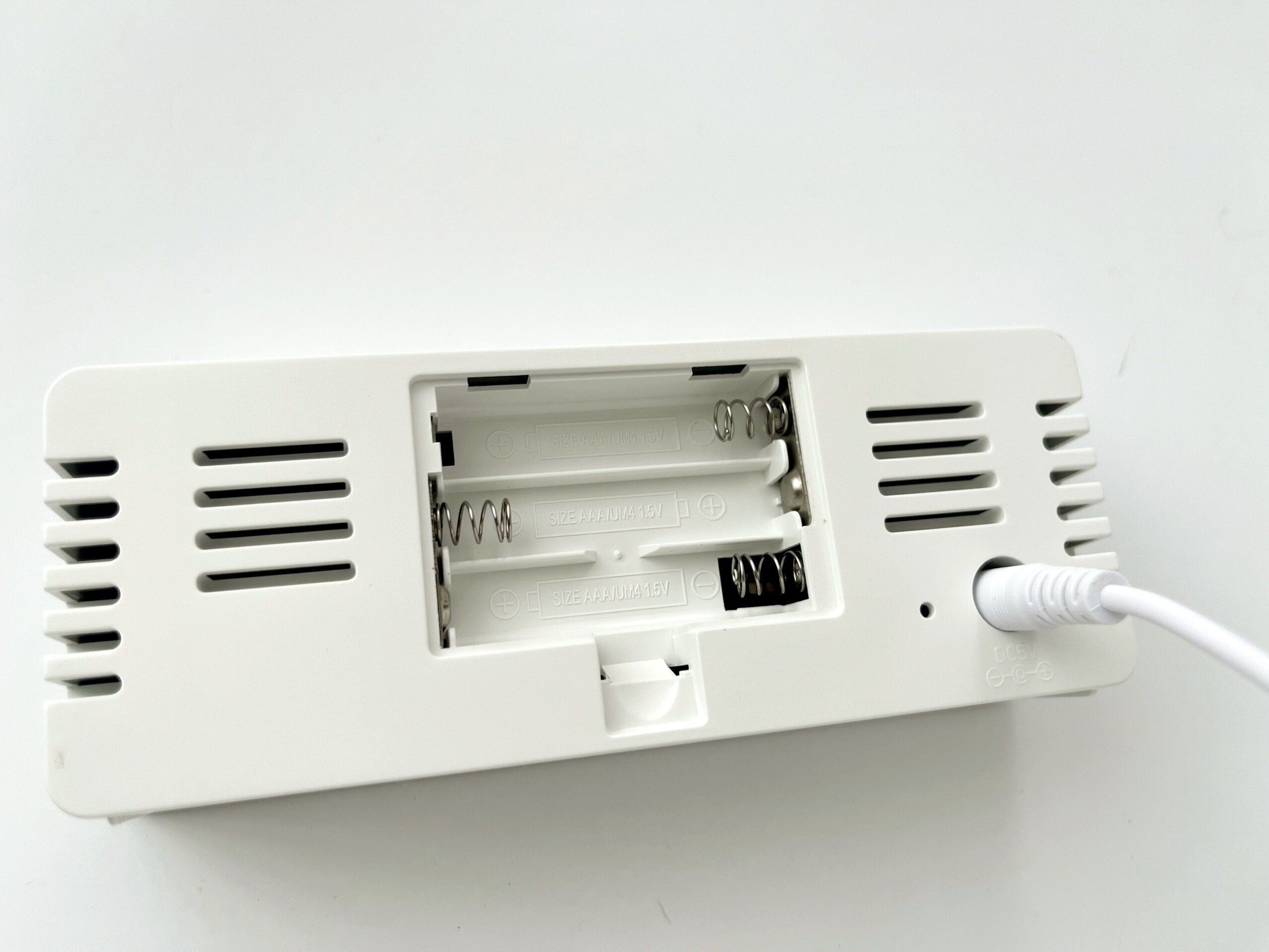 主にUSB電源を使用し、電池は時刻や日付、アラームなどの設定バックアップ用です。