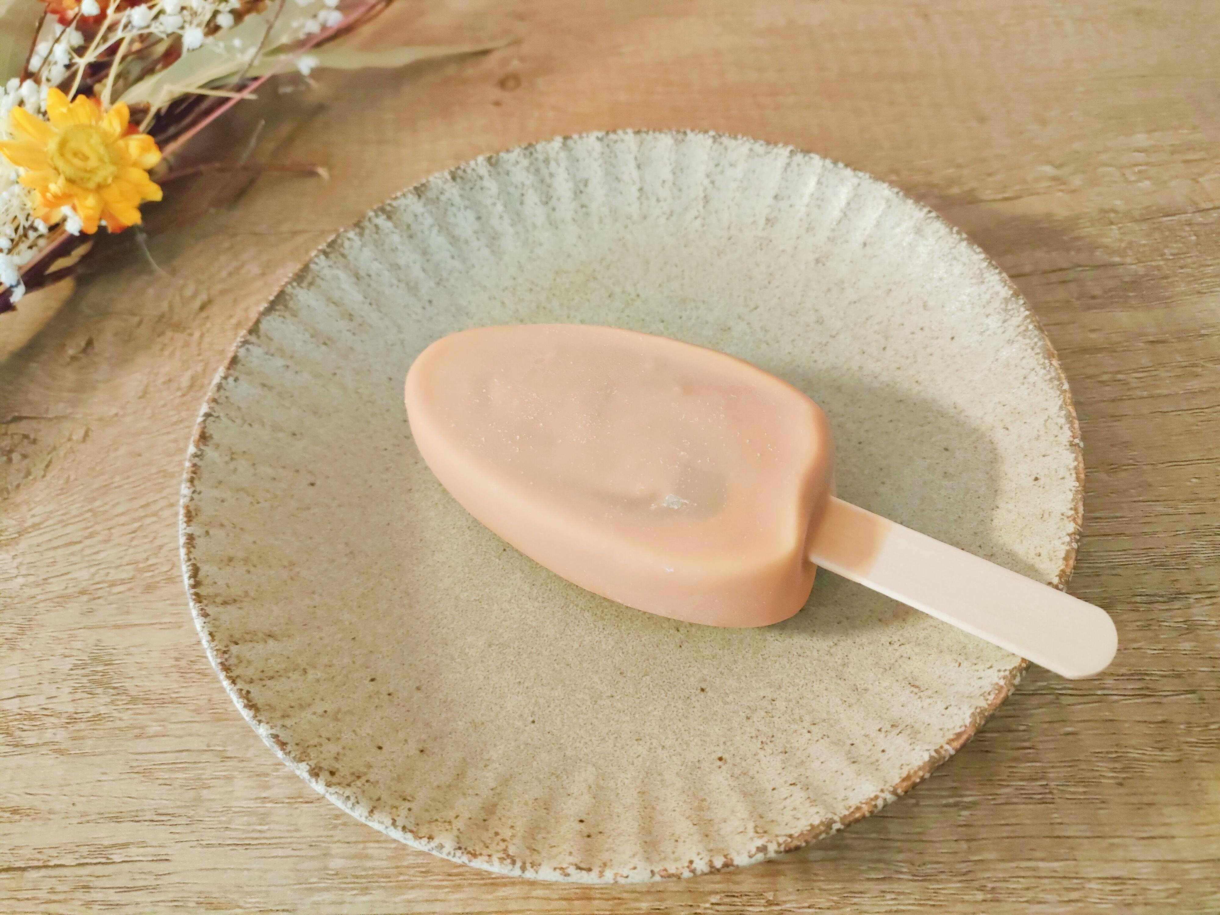 袋から取り出してみると、いつもはチョコレートコーティングのパルムが、ベージュっぽいキャラメルチョコレートで包まれています。