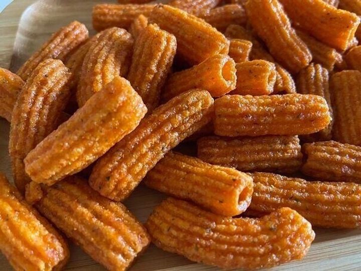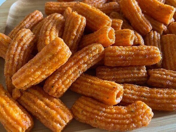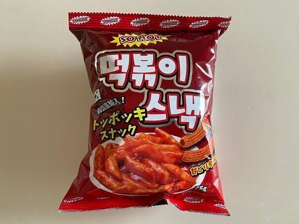 人気の韓国フード、トッポッキをスナック菓子で再現したもの。「SO HOT」の文字があり見た目も真っ赤で辛そう!