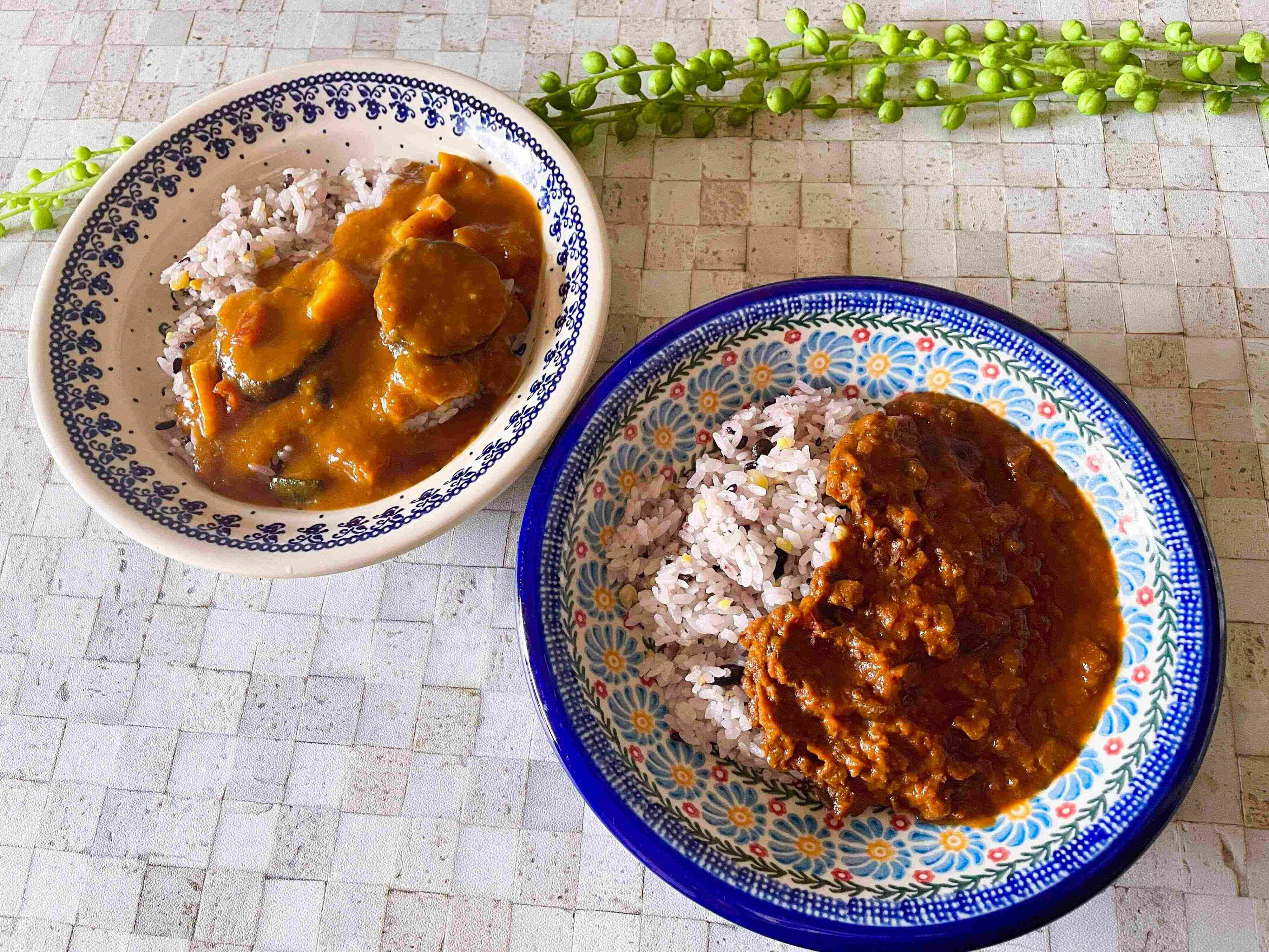 セブンプレミアムの「大豆ミートのキーマカレー」と「ごろっと野菜カレー」