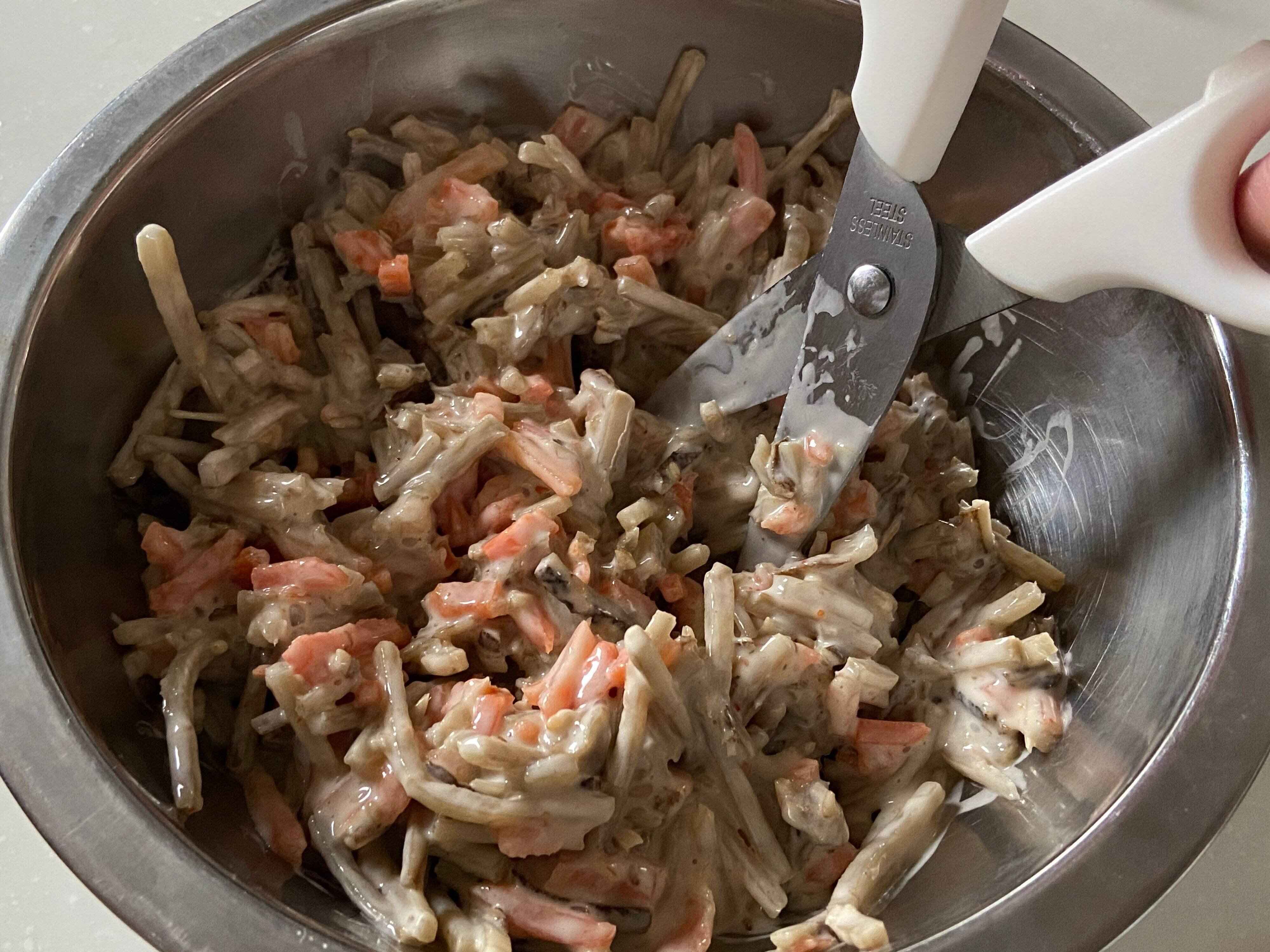 まずゴボウサラダをボウルにあけてキッチンバサミで少しカットします。だいたいごぼうの長さが1/2か、1/3くらいになればOK。