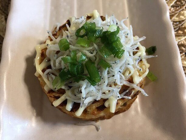 子どもたちのお気に入りはこちら。ミニサイズのお好み焼きにマヨネーズとしらすとネギをトッピング。ほんのりだしのきいた味わいのお好み焼きとしらすが抜群に合います。