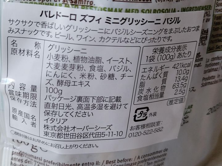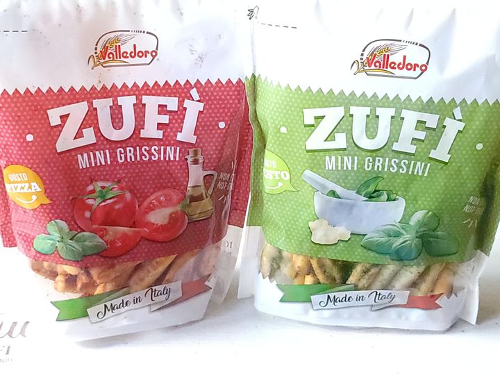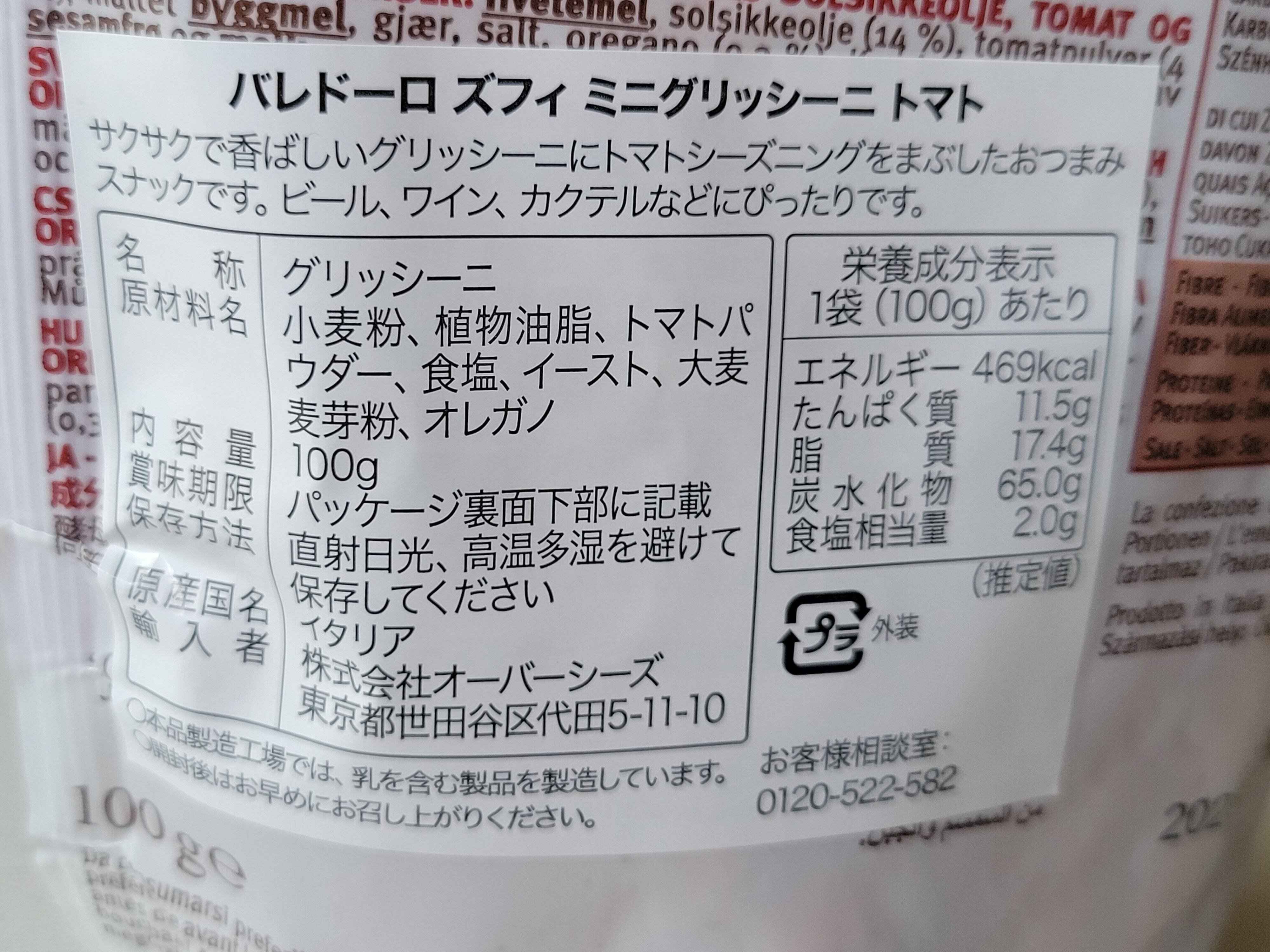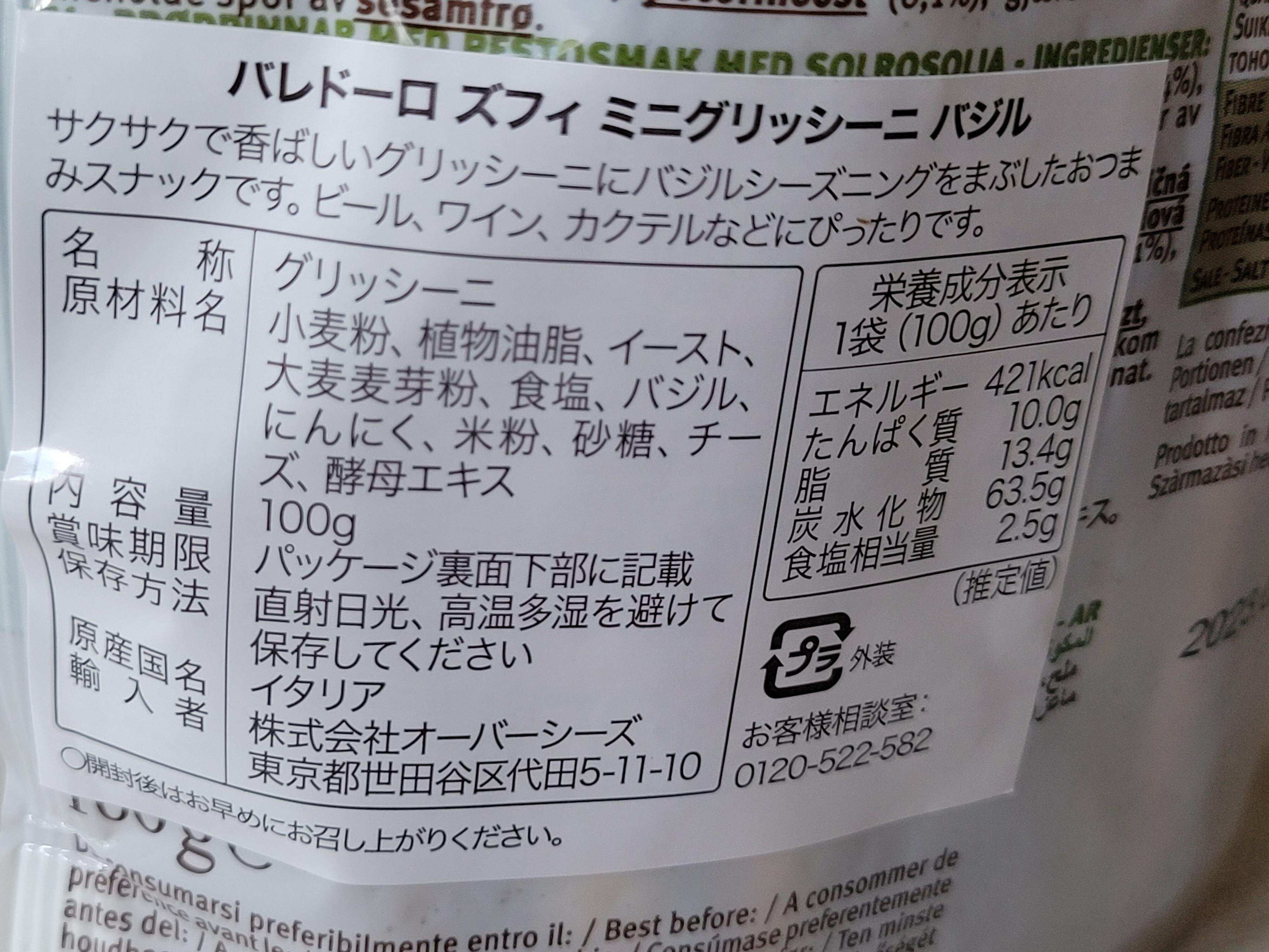 イタリア、バレドーロ社(Valledoro S.p.A)のズフィミニグリッシーニは、トマト味、バジル味ともに1袋あたり100g入って258円で販売されています。