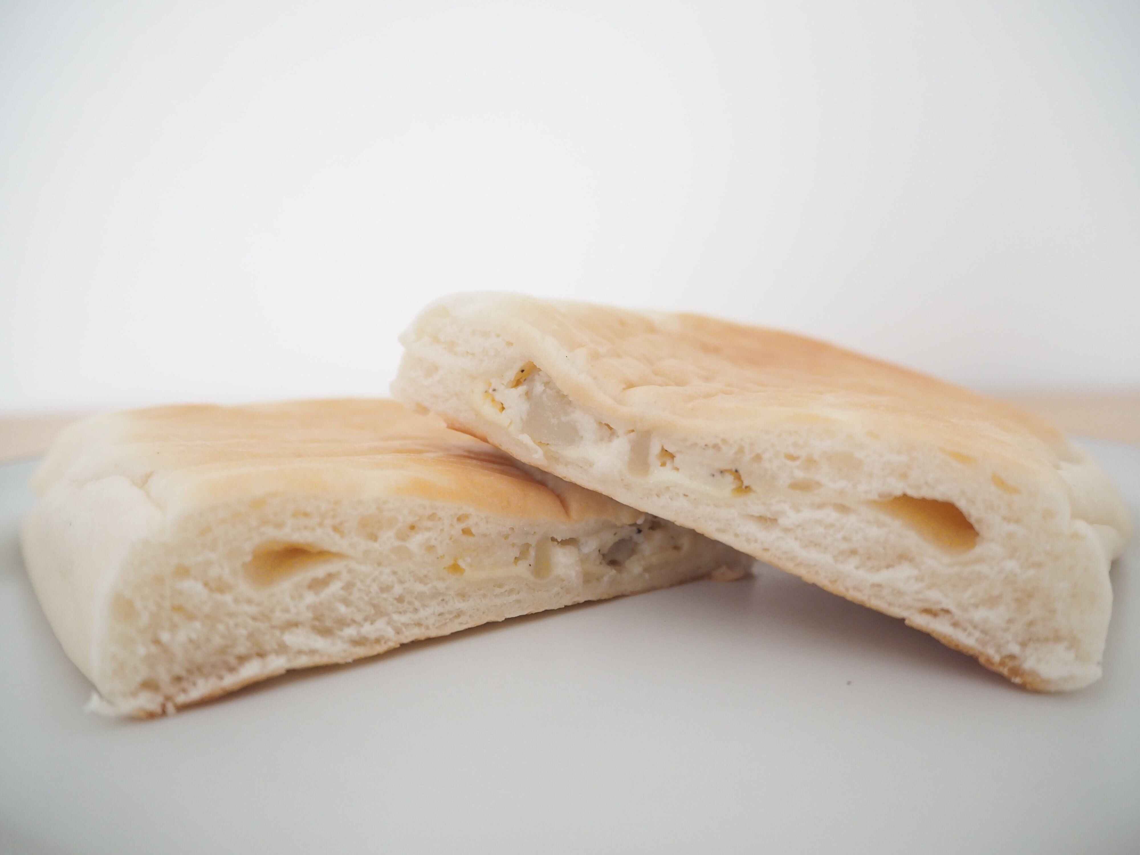 甘みのあるポテトサラダの中でチーズとこしょうがときどき香り、いいアクセントに。じゃがいもの食感がしっかり残っているのもいいですね。そのポテトサラダの水分を吸って、パンの内側はもちもち食感を味わえます。