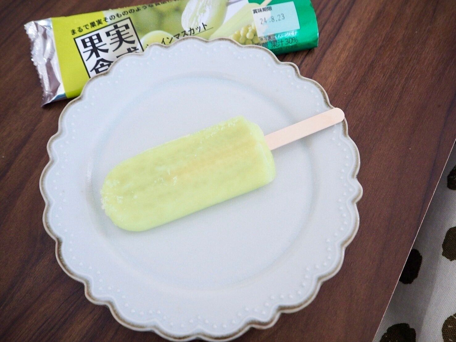 袋から取り出してみると、本物のシャインマスカットと同じ淡いグリーンのアイスがお目見え。