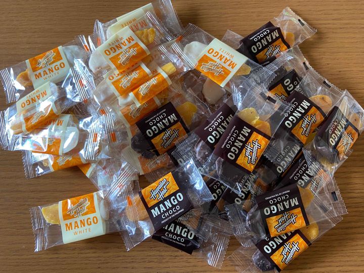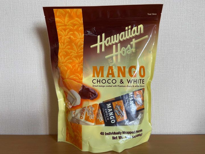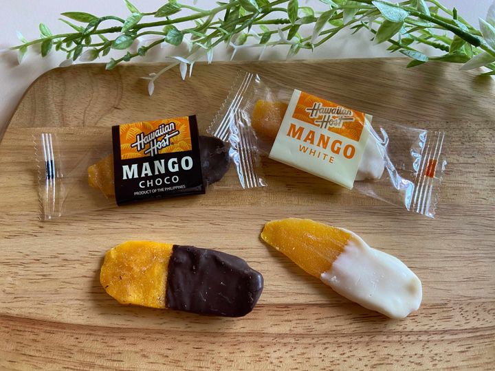 ハワイアンホーストといえばハワイの定番土産、マカデミアナッツチョコレートが有名ですが、今回はドライマンゴーに2種類のチョコがコーティングされたもの。