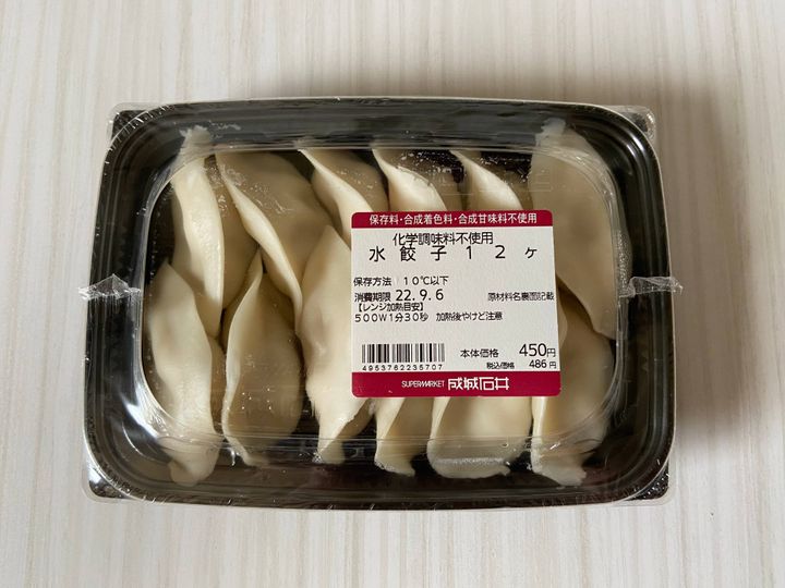 成城石井の「水餃子」(購入時:486円)は自家製惣菜の隠れた人気商品!筆者は初めて食べた時にもっちもちの皮の食感に驚き、そのおいしさに何度もリピートしています。