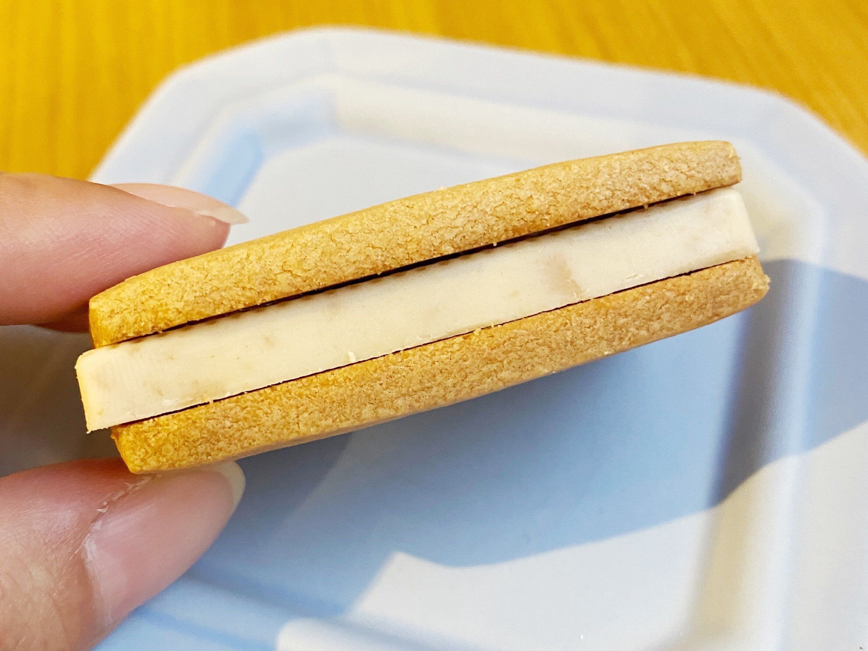 発酵バターを使用したクッキーでホワイトチョコレートをサンドしたチョコ菓子。