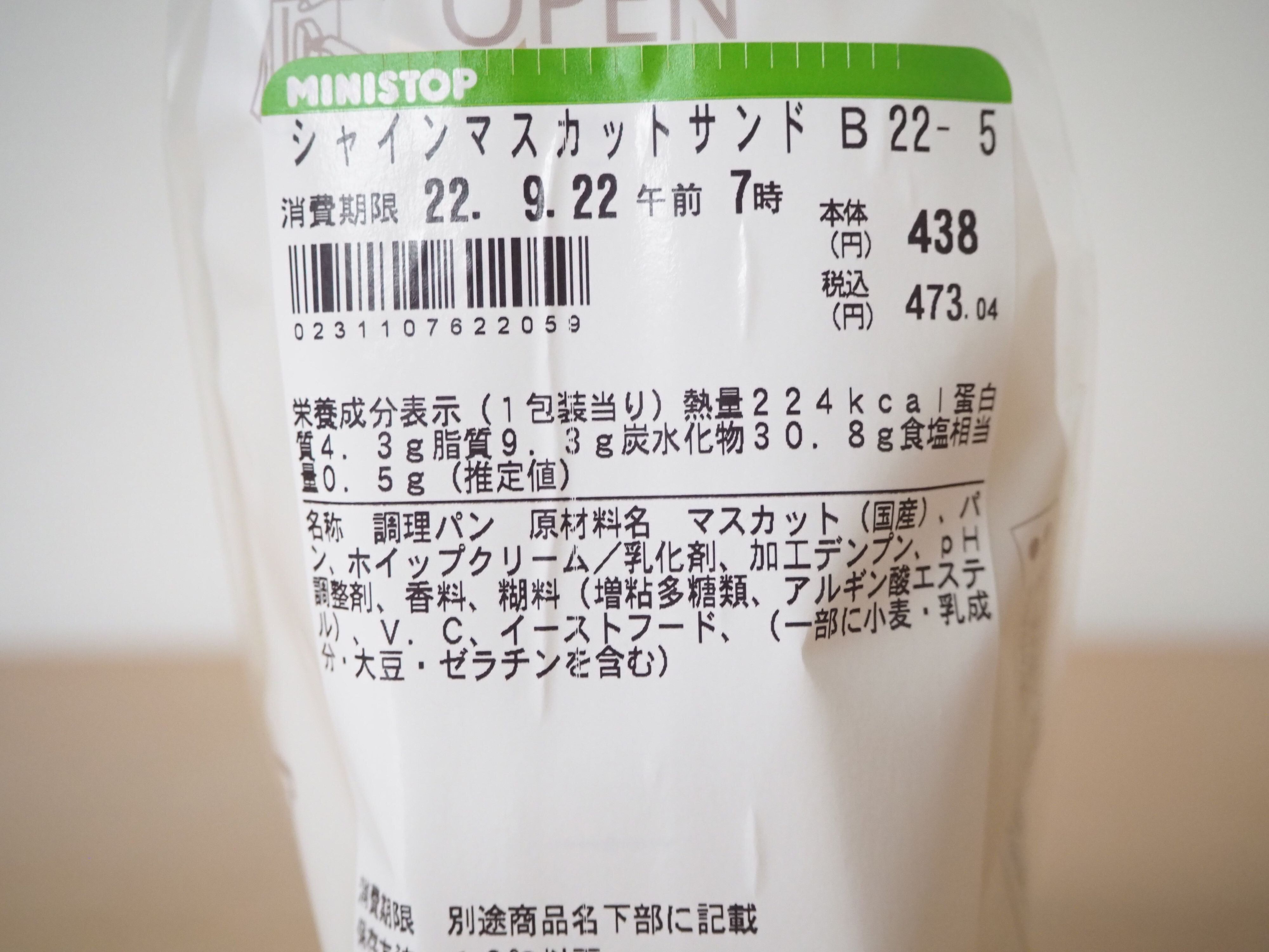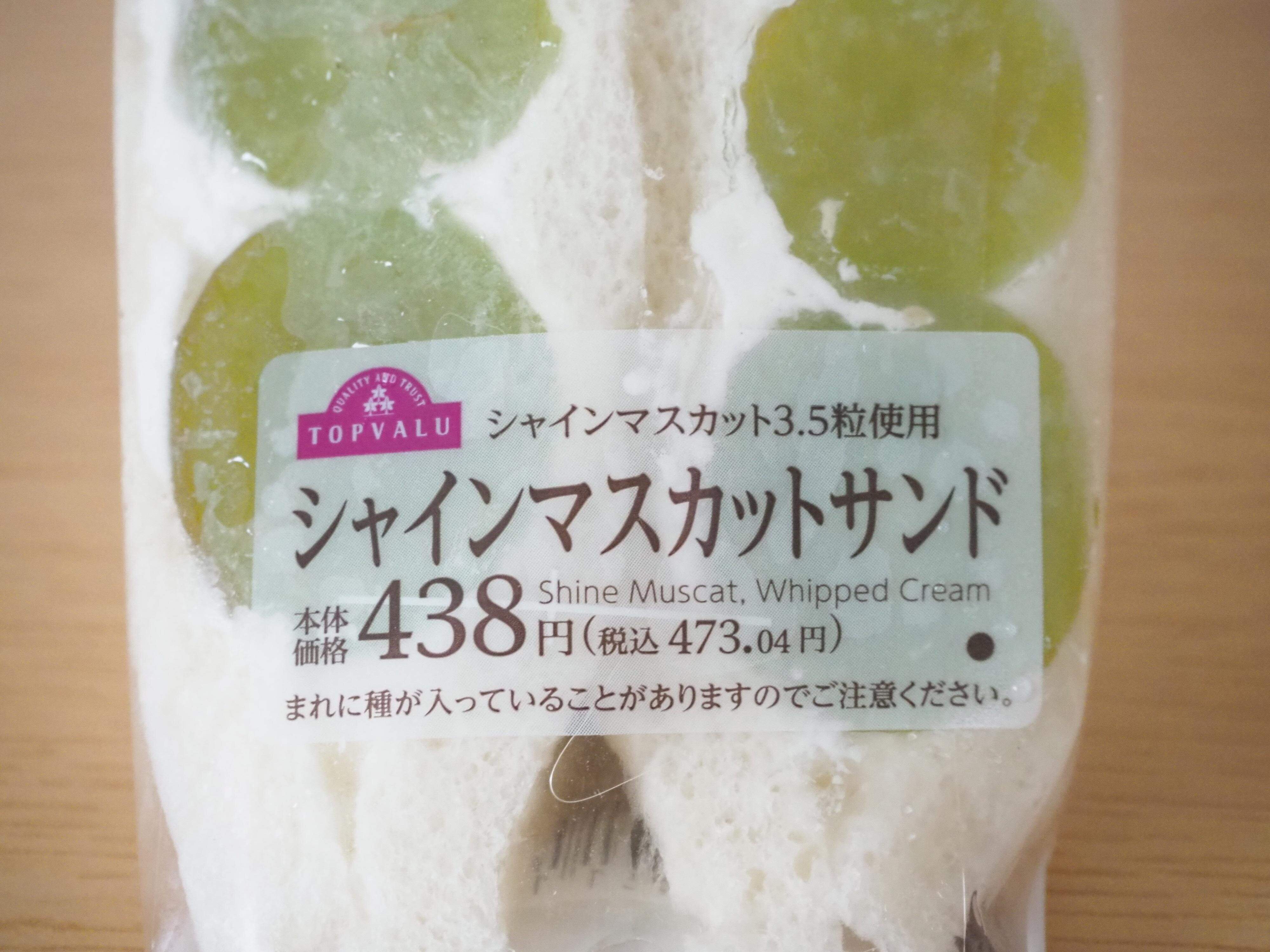 こちらが「シャインマスカットサンド」で、価格は473.04円。常温のパンコーナーではなく、冷蔵のパンコーナーで見つけることができました。