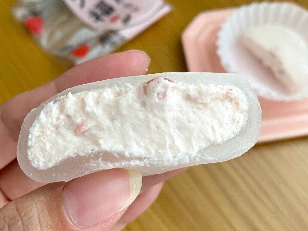 パッケージからお皿に移すと、薄いわらび餅でクリームが包まれていて見た目はまるで「雪見だいふく」。慎重に持ち上げないと潰してしまいそうな柔らかさです。