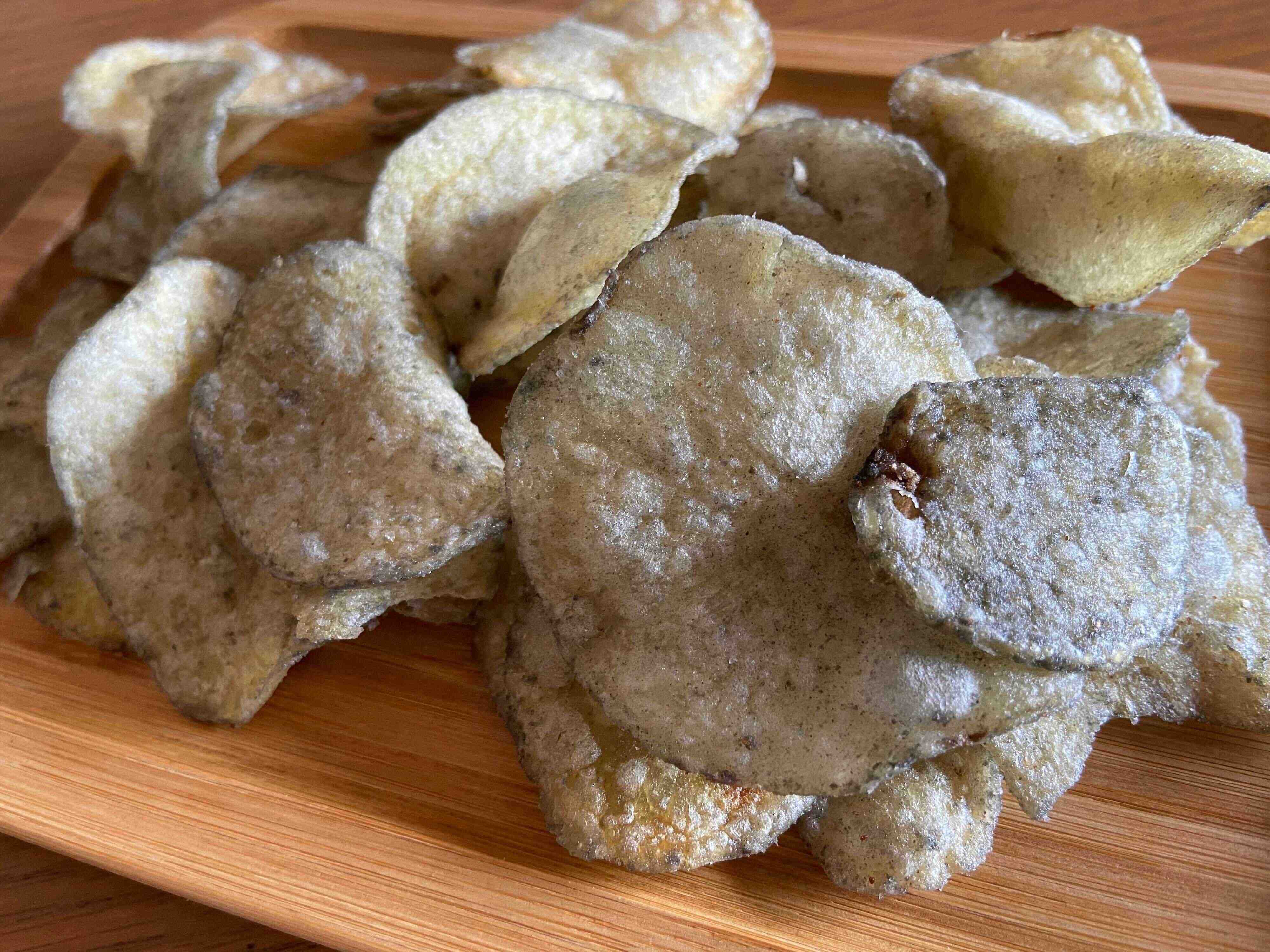 袋を開けてみると黒いパウダーをまとったポテトチップスが。厚みがありザクザクと食べ応えのあるこのポテトチップスは、職人が手揚げして作っているそう。