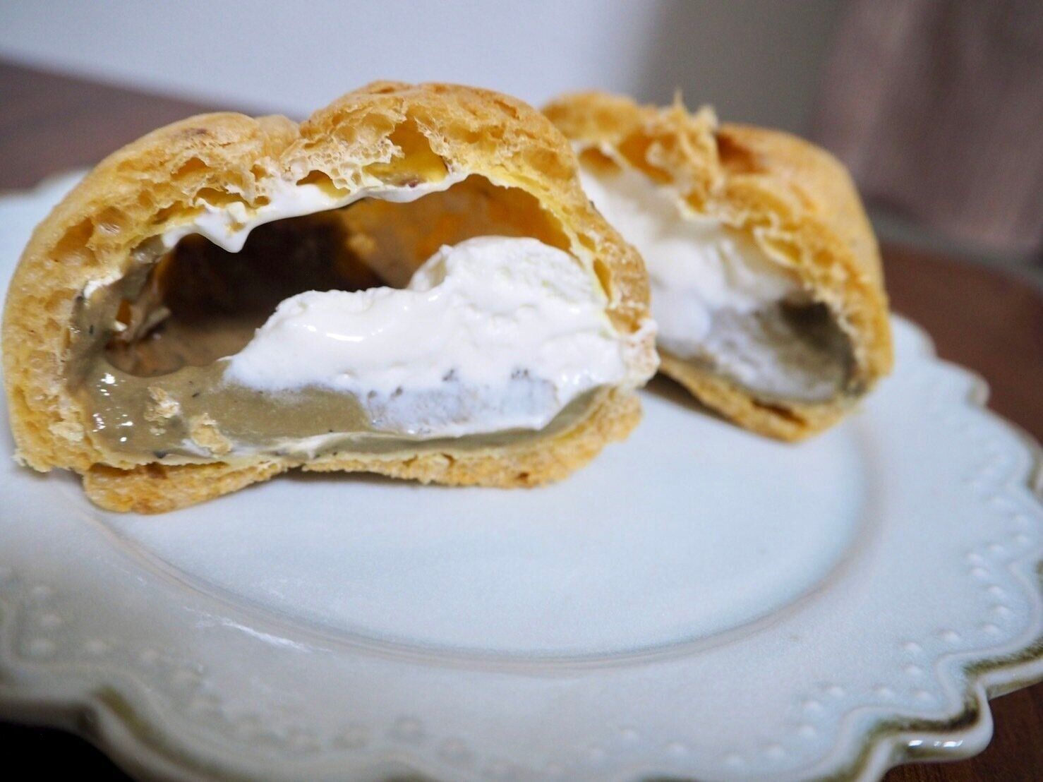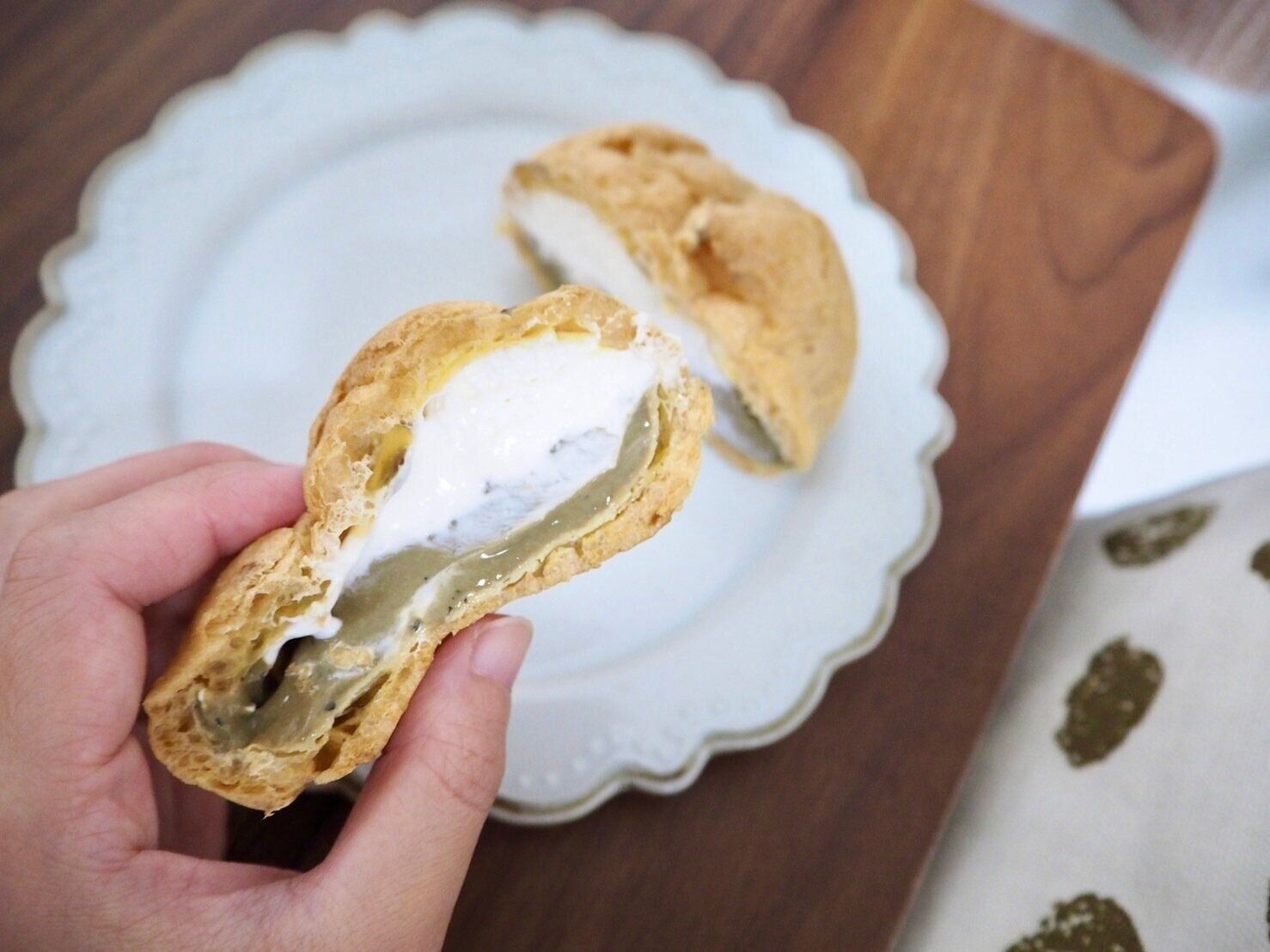 ほうじ茶クリームとホイップクリームのダブルシュークリームです。
