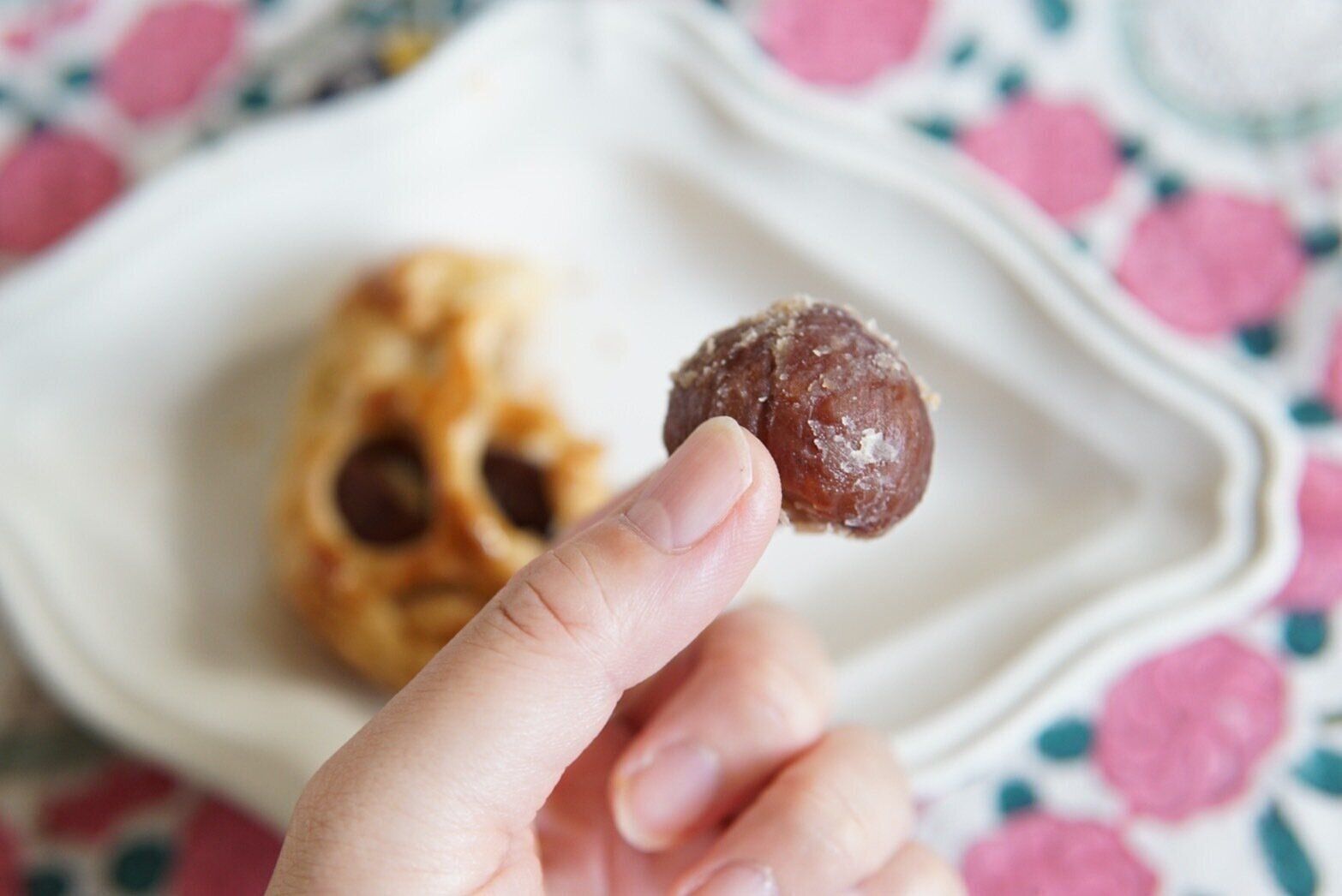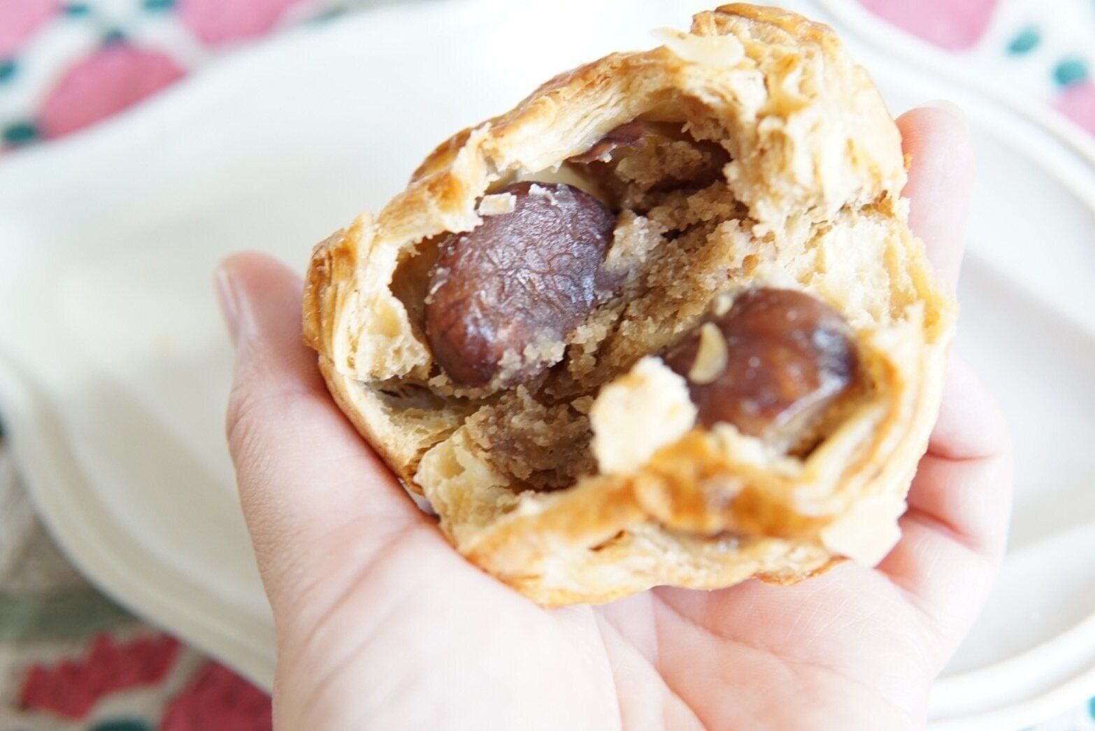 パイ生地を割ってみると、中からは渋皮栗の甘露煮とマロン餡がぎっしりと詰まっていました。栗は、丸ごとが1個とカットしてあるものが2個。個体差はあるかもしれませんが、私がいただいたものは、2個半以上のボリュームがありました。とても甘そうに見えるかもしれませんが、栗の甘露煮もマロン餡も、甘さは控えめだと感じました。その分、栗らしい甘味がしっかりと感じられて、くどさを感じずにパクパクと食べ進めることができました。