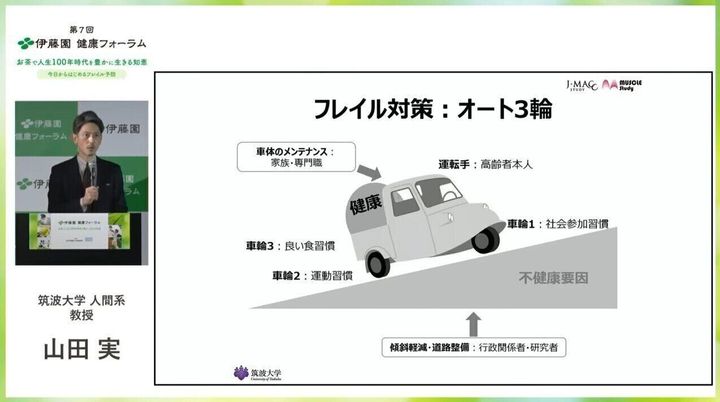 「第7回 伊藤園健康フォーラム」では最初に、筑波大学 人間系 教授・山田実氏による基調講演「今から備えるフレイル対策 ―100年人生を見据えたミドル・シニア世代からできること―」が行われました。