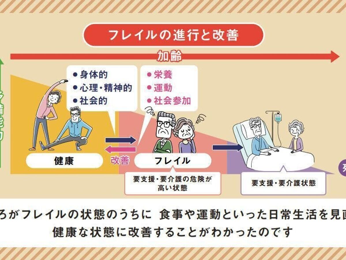これまでは、加齢によってフレイルから要介護の状態に進むものとされてきましたが、「フレイル状態」や「プレ・フレイル」の際に食事や運動などの習慣を見直すことで、健康な状態に改善できることが明らかになっています。