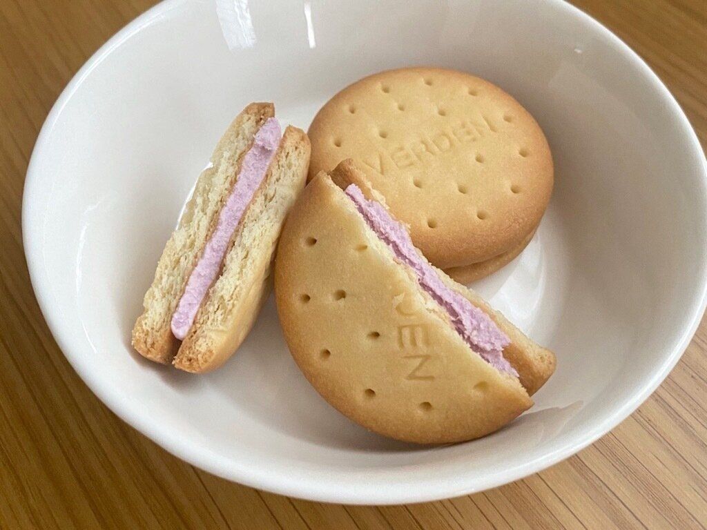 豆乳が練り込まれたビスケットはサクサクで素朴な味わい。紫いもクリームも素朴で優しい味わいですが、紫いもの味はしっかりと感じます。ひとくち目からふわっと香り、噛むたびにふわふわっと風味がひろがり、食べ終わった後に余韻も残るほど。