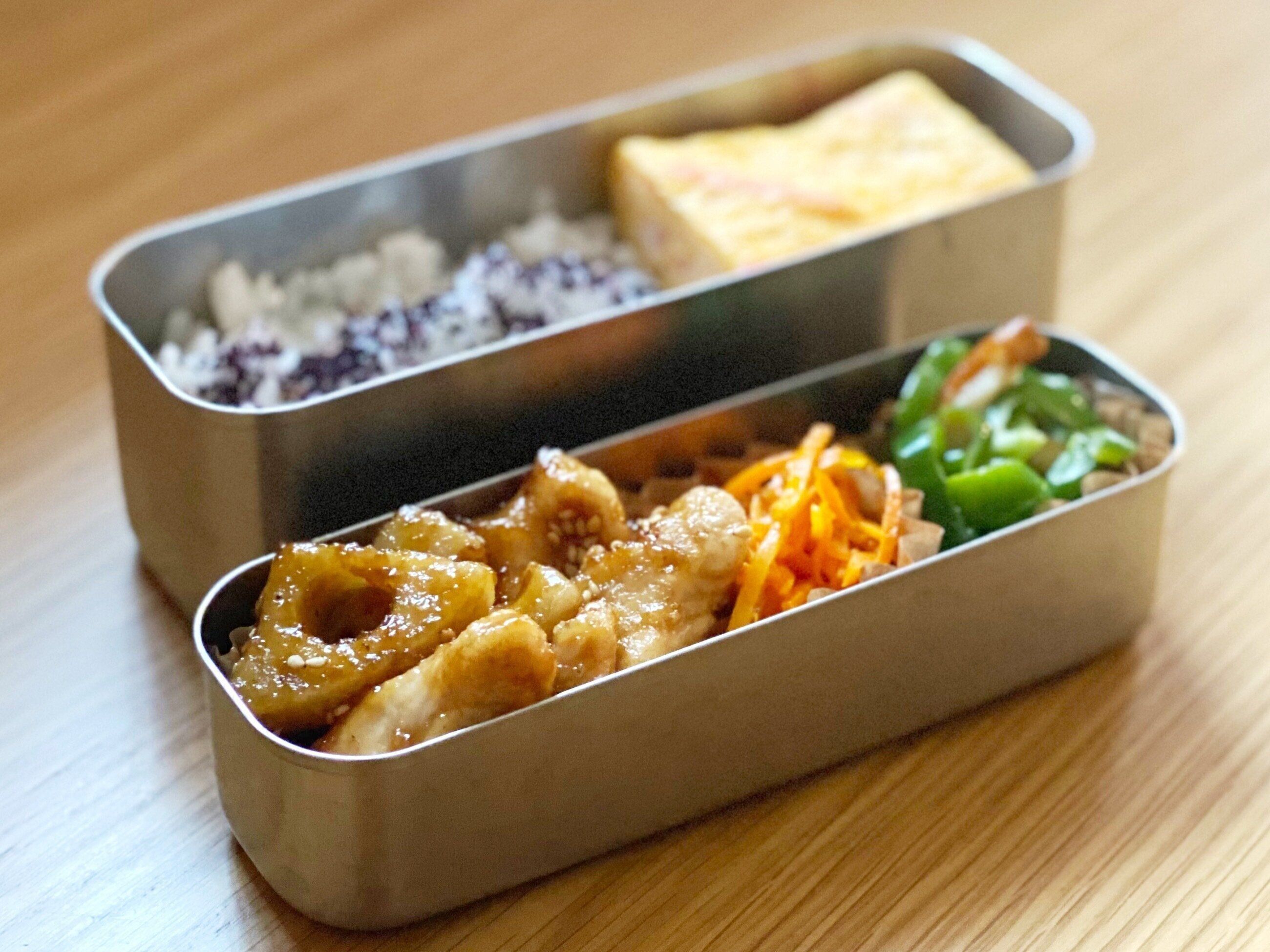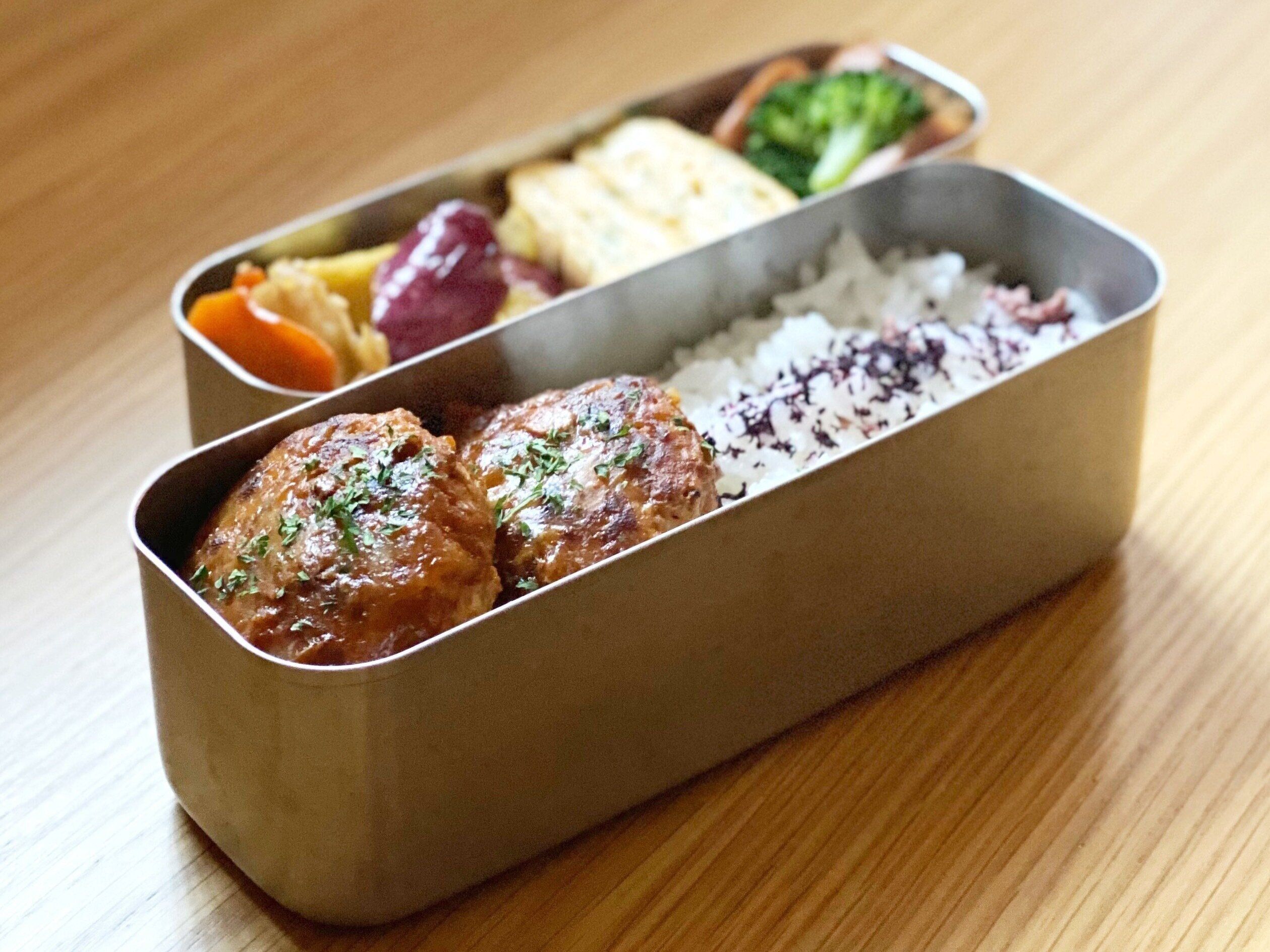 この日のメインのハンバーグと副菜のレンコンのきんぴらは晩ご飯の残り。スライドおかずが2品あると朝は非常に楽なので、副菜に手間のかかるおかずもつくれます。