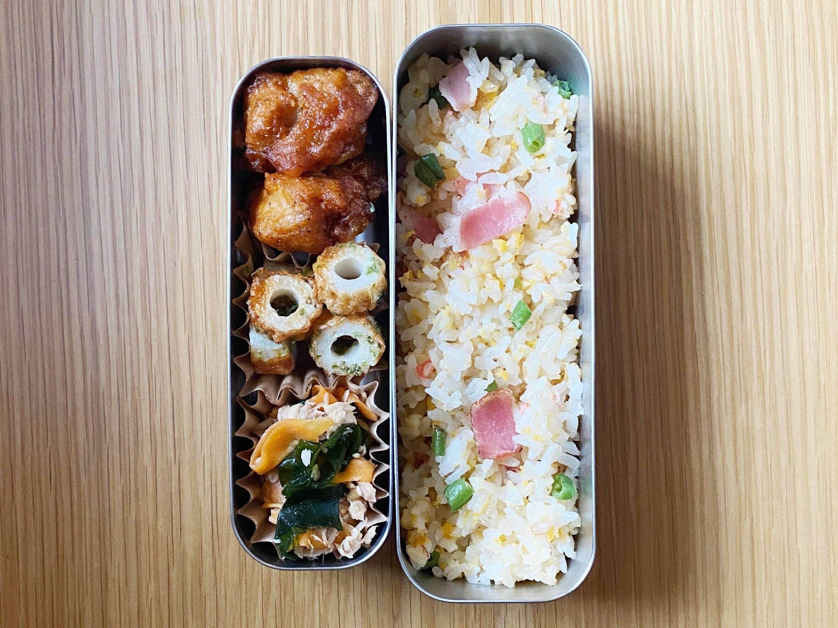 この日は、冷蔵庫に半端に余っていた食材を使ってチャーハン弁当です。