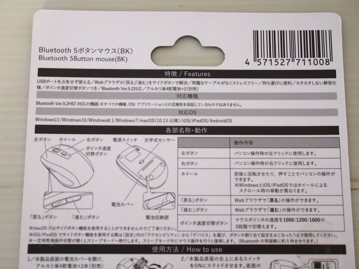 右・左ボタンはもちろん、ホイール(回転させてスクロールする部分)、親指にあたる部分にWEB画面上の戻る・進むボタンもついています。※戻る・進むボタンは使用する端末によっては利用できないものがあります