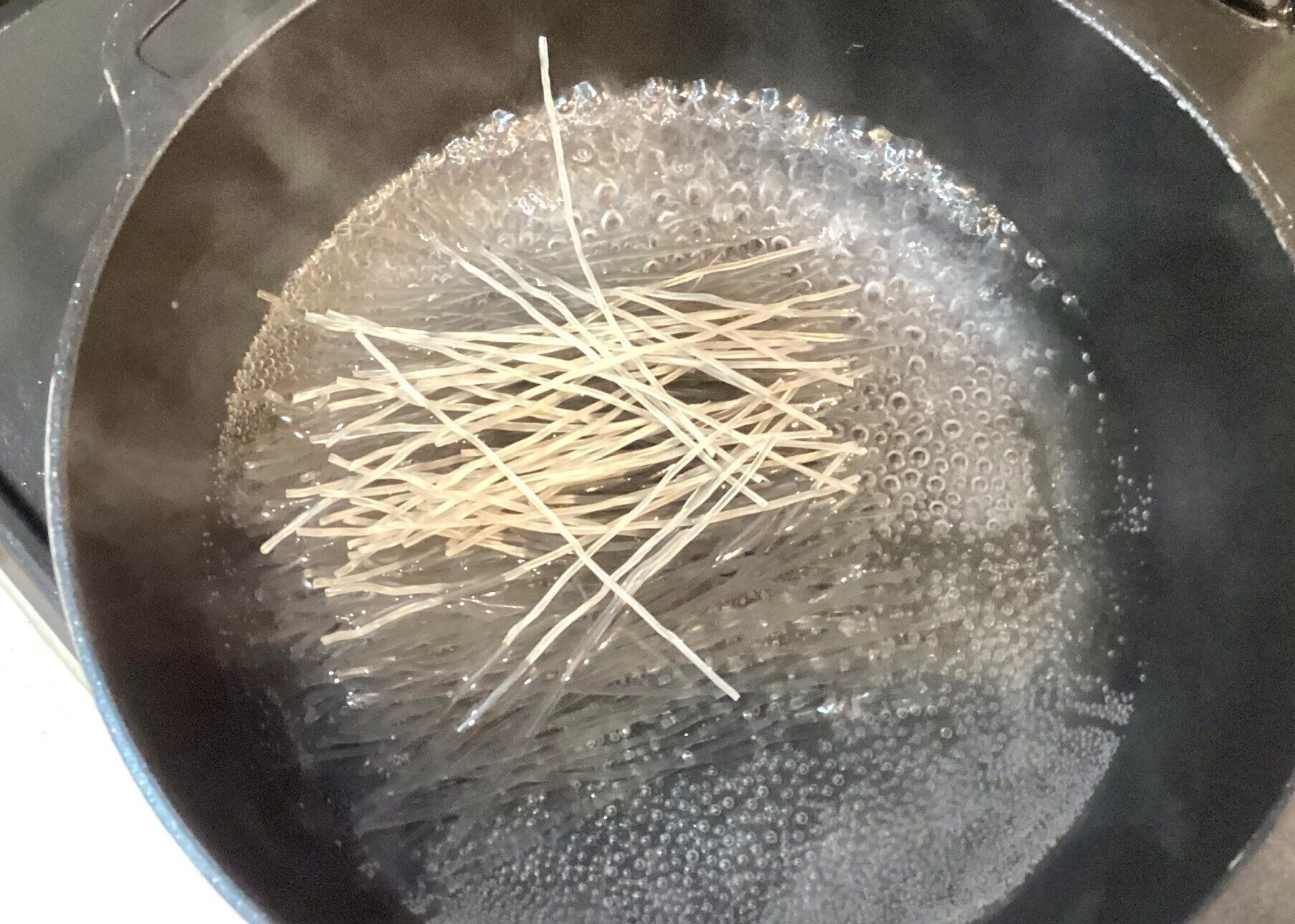 1 フライパンにお湯(500ml以上)を沸騰させ、春雨を6分間茹でます。茹でたら湯切りして置いておきます。