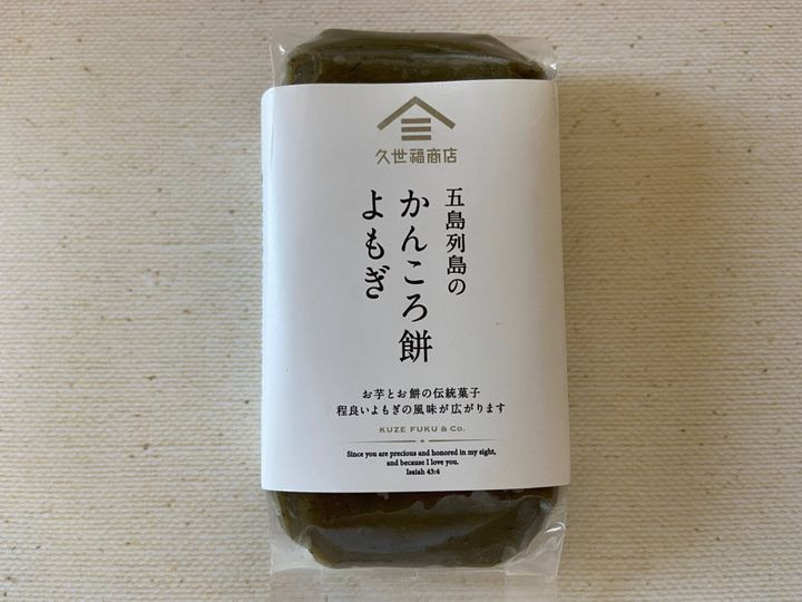 かんころ餅とは干し芋を蒸してもち米と混ぜて作られている、長崎県五島列島のご当地菓子。プレーン、紫芋、よもぎの3種類が店頭に並んでいました。