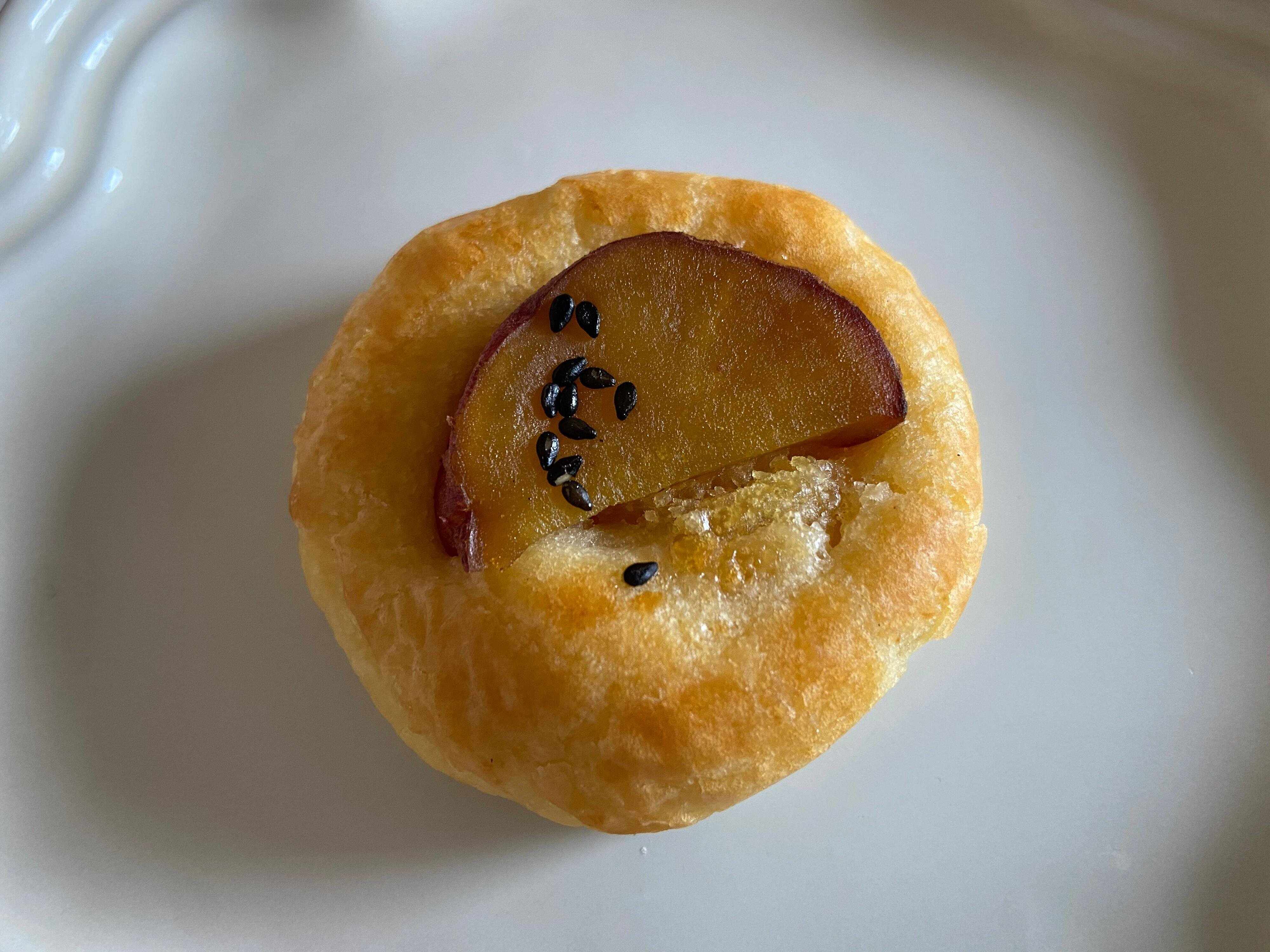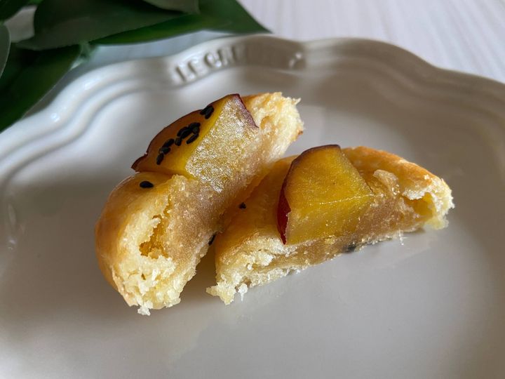 カットしてみるとパイ生地に中にはたっぷりのさつまいも餡が!ほっくり甘くておいしいさつまいもがたっぷり詰まったパイで、上に載ったさつまいもも存在感があり、小さいのに大満足のさつまいも好きにはたまらない一品。買って正解!のおいしさでした。