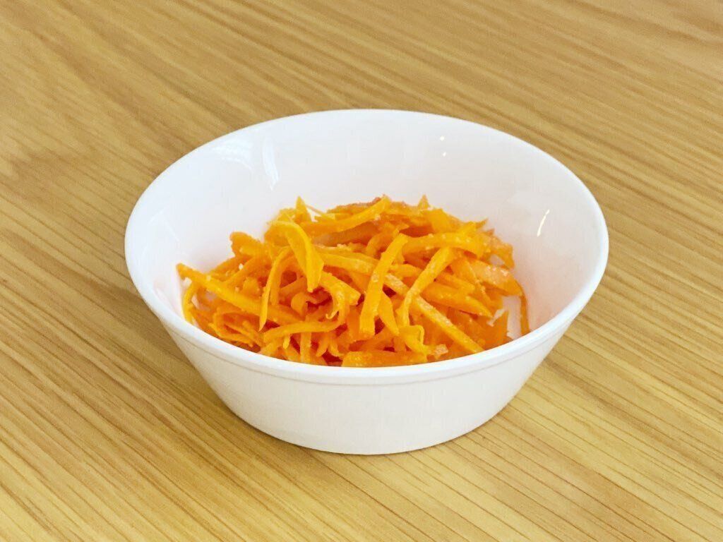 千切りにしたニンジンを電子レンジで加熱し、たらこスプレッドを和えて完成。