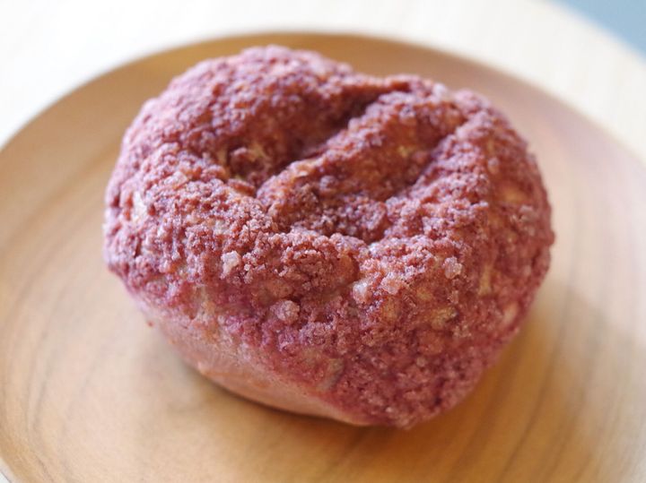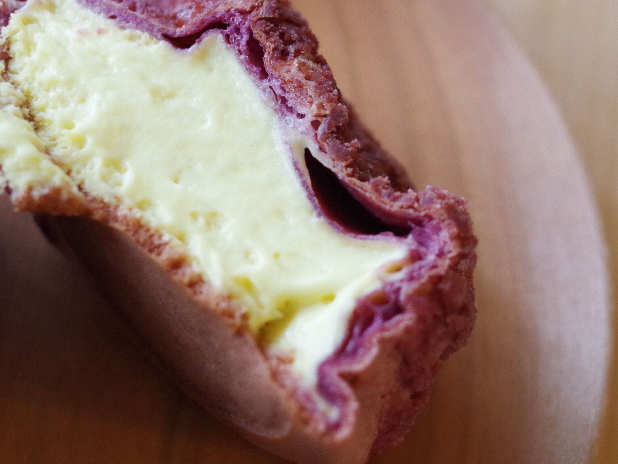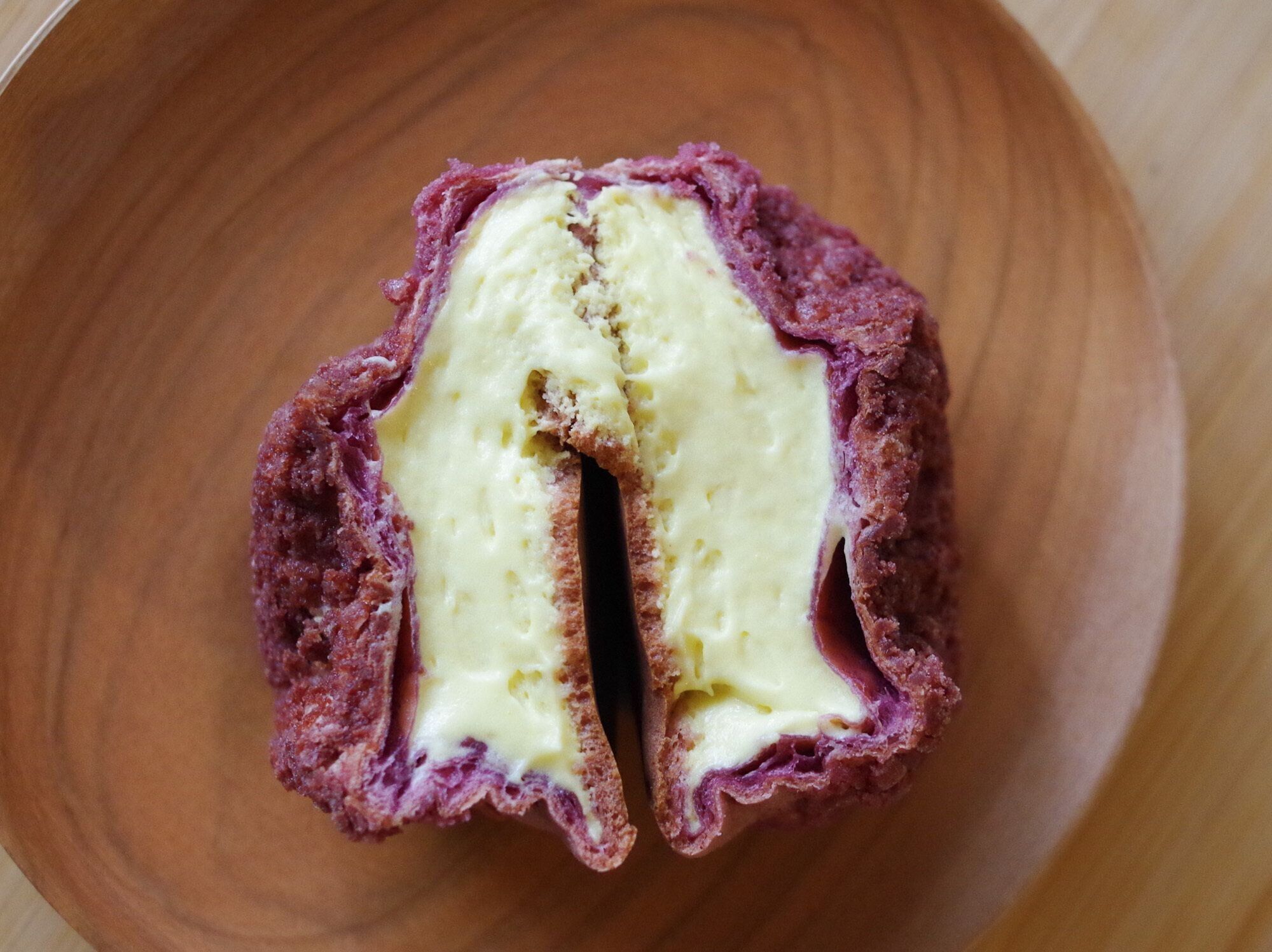 シュークリームの表面は、まるでさつまいものような紫色。デコボコとしたシュー皮は、柔らかそうです。