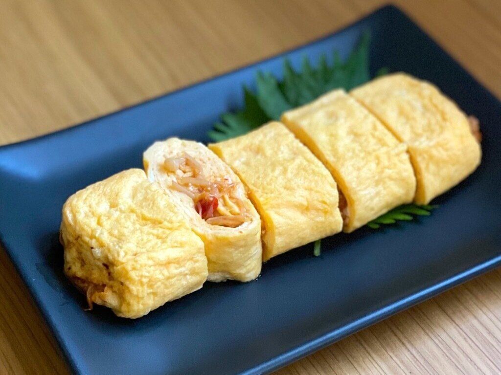中心に明太子なめ茸を入れ、いつもの卵焼きをつくる感じでクルクルと巻きながら焼き上げます。