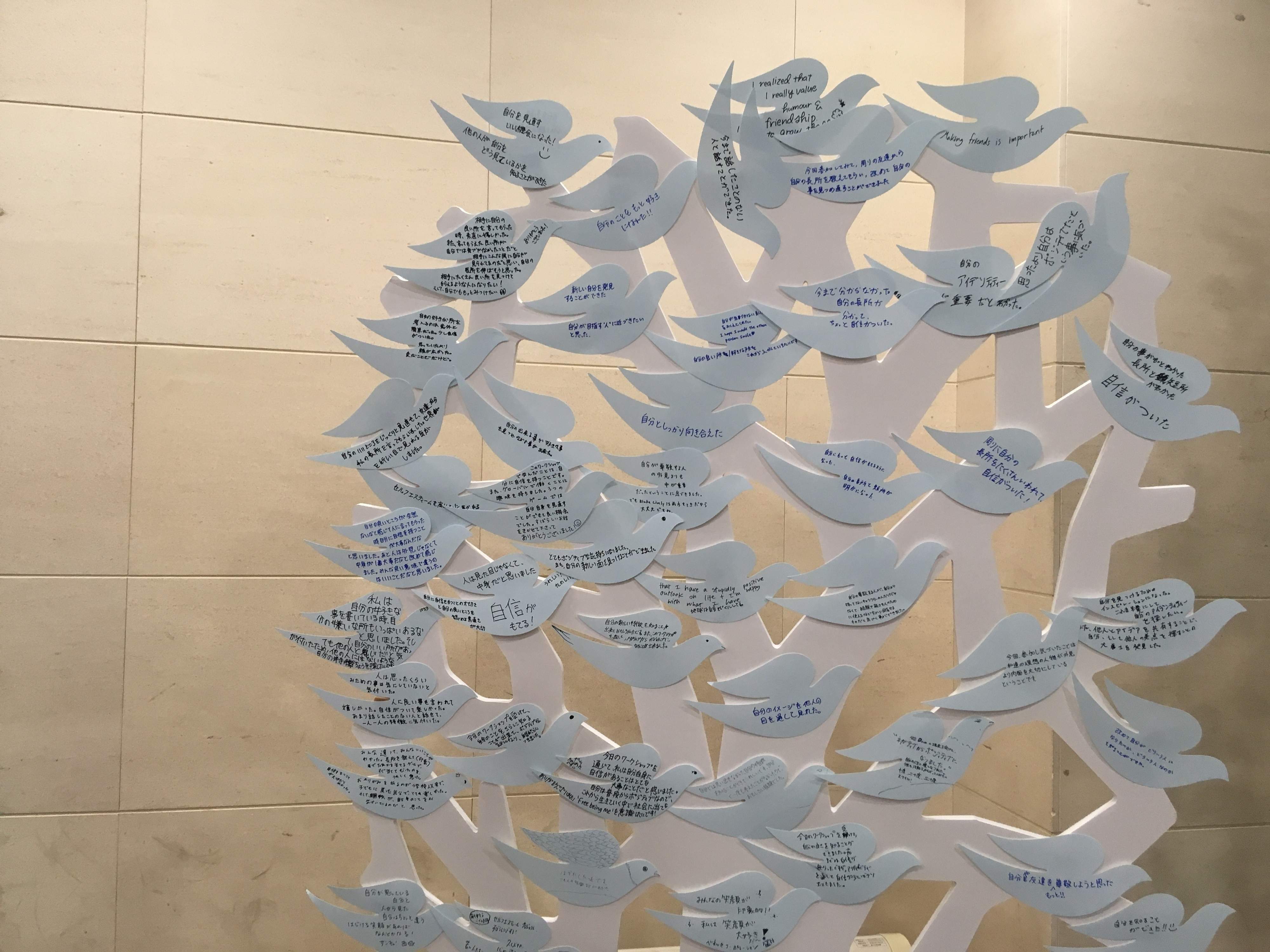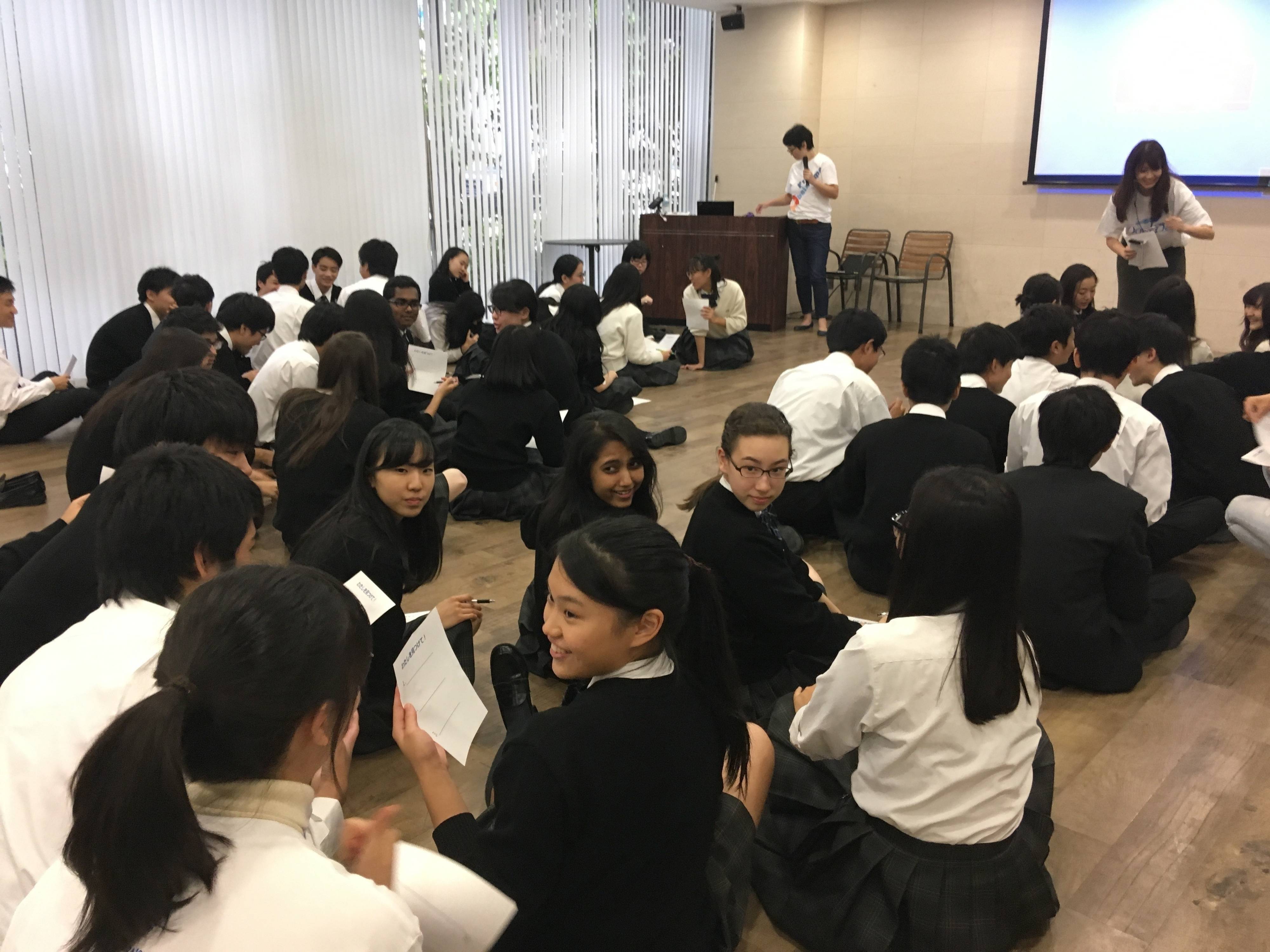 最後は、折り紙に容姿についても含めた「自分のいいところ8つ」を書いて、いろいろな人とセッションするプログラム。最初のプログラムと同様、「8つも書けない!」という声も聞こえつつ、だいぶ“自分自身を見つめるコツ”がつかめてきた様子。書き終わったら、一対一でいろんな人と発表しあい、お互いについて認め合います。会場はすっかり打ち解けた空気に包まれ、中には思わずハグし合う生徒も!